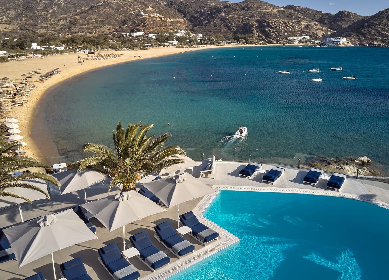 Ios Palace Hotel & Spa is the epitome of Cycladic beauty condensed in a bright white microcosm at the edge of Mylopotas bay in Ios island. Open your eyes wide and drift away for a brief flight over the golden, sandy beach. You are surrounded by impressive, hip, elegant designs in perfect harmony with luxurious details and exclusive services.