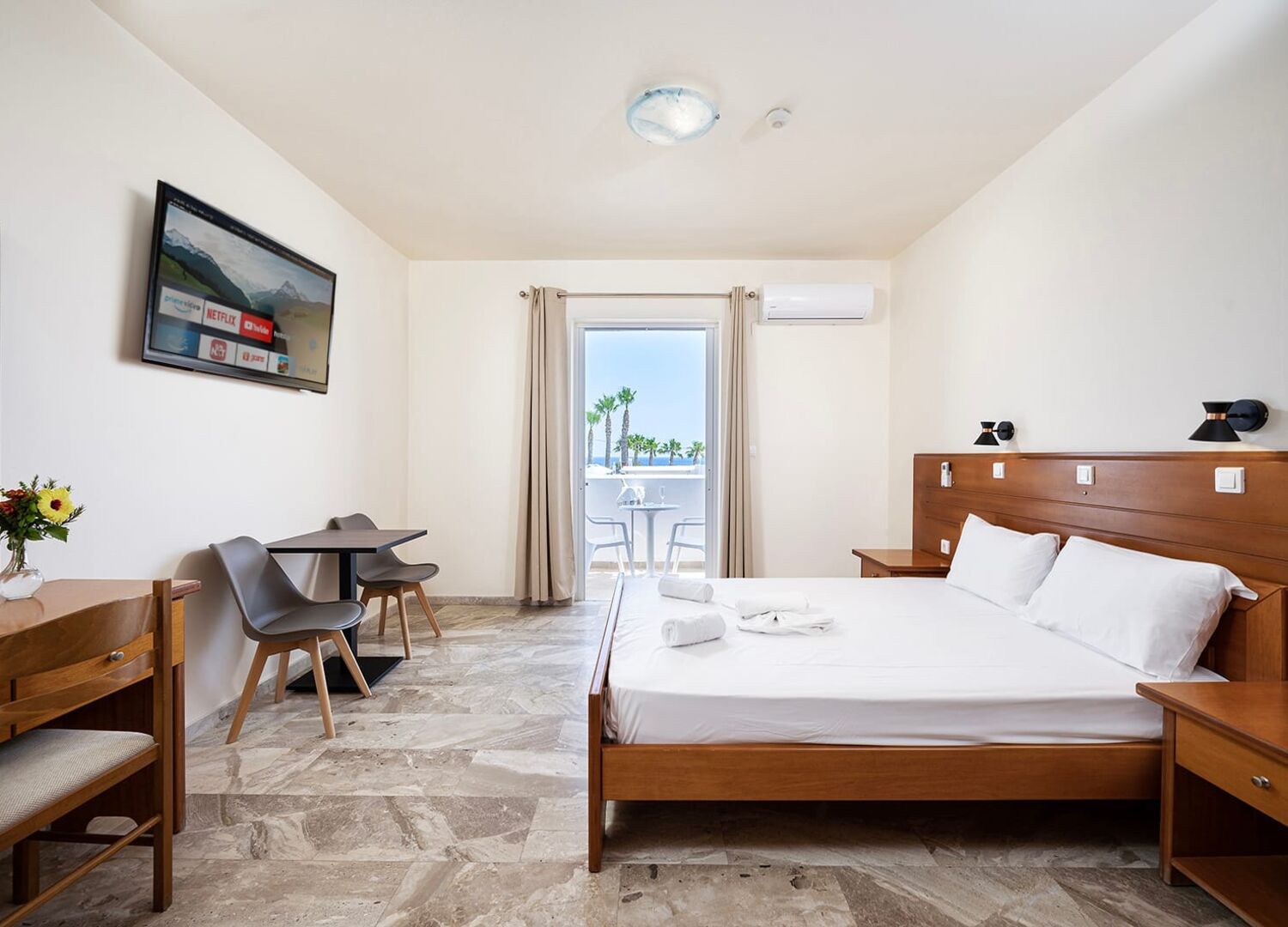 My husband and I stayed for a week in Mammis Beach Hotel. It was faboulus! All staff is very friendly and polite. Rooms have a lot of space and are very clean. Airconditioning works perfectly. Coctails are amazing! Food was great as well. The hotel has everything, pool, private beach with sunbeds, restaurant, bar, pool table, small library corner. The city is close, 15 minutes by foot, and the bus stops by the hotel too. We loved it here!