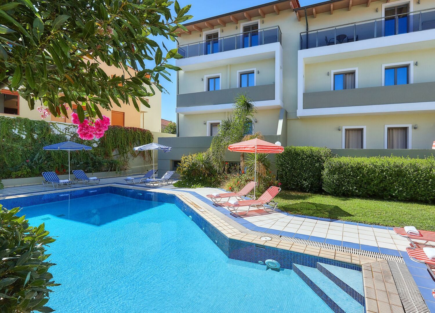 The PANORMO Beach Hotel is located in the Village of PANORMO which is a historic coastal village found in the heart of Crete. The architecture and idyllic natural landscape provides a perfect place for a relaxing and fun vacation. PANORMO Beach is just 20 meters from the sea and it offers 43 rooms. The hotel consist of  3 floors with 1 elevator, a main restaurant, lounge bar, roof garden bar, swimming pool, internet corner and a conference center which can accommodate up to 100 persons. The hotel also provides a large private parking area. All the rooms are equipped with air-conditioning, satellite TV, radio, telephone, safe box, refrigerator, free internet access, hydro massage, and hairdryer. Furthermore, all the rooms are equipped with coffee and tea facilities. Laundry service is also available.