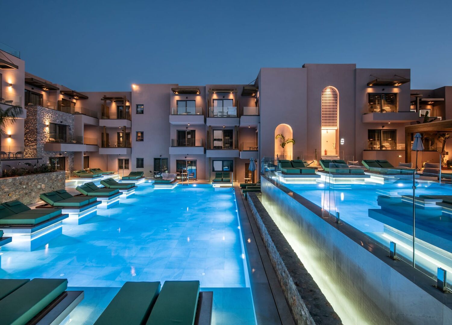 Paralos Venus Suites is a luxurious Adults Only hotel located in a quiet area in Analipsis Hersonissos, Crete. The fully renovated complex offers fully furnished accommodation units with modern amenities, including Smart TVs and espresso coffee machines. Guests can enjoy access to two a la carte restaurants, a rooftop gym, a massage room with steam bath, and three main pools, including a Quiet Zone Pool. The hotel also features a playroom, a small library, and a wine cellar with Greek wines.