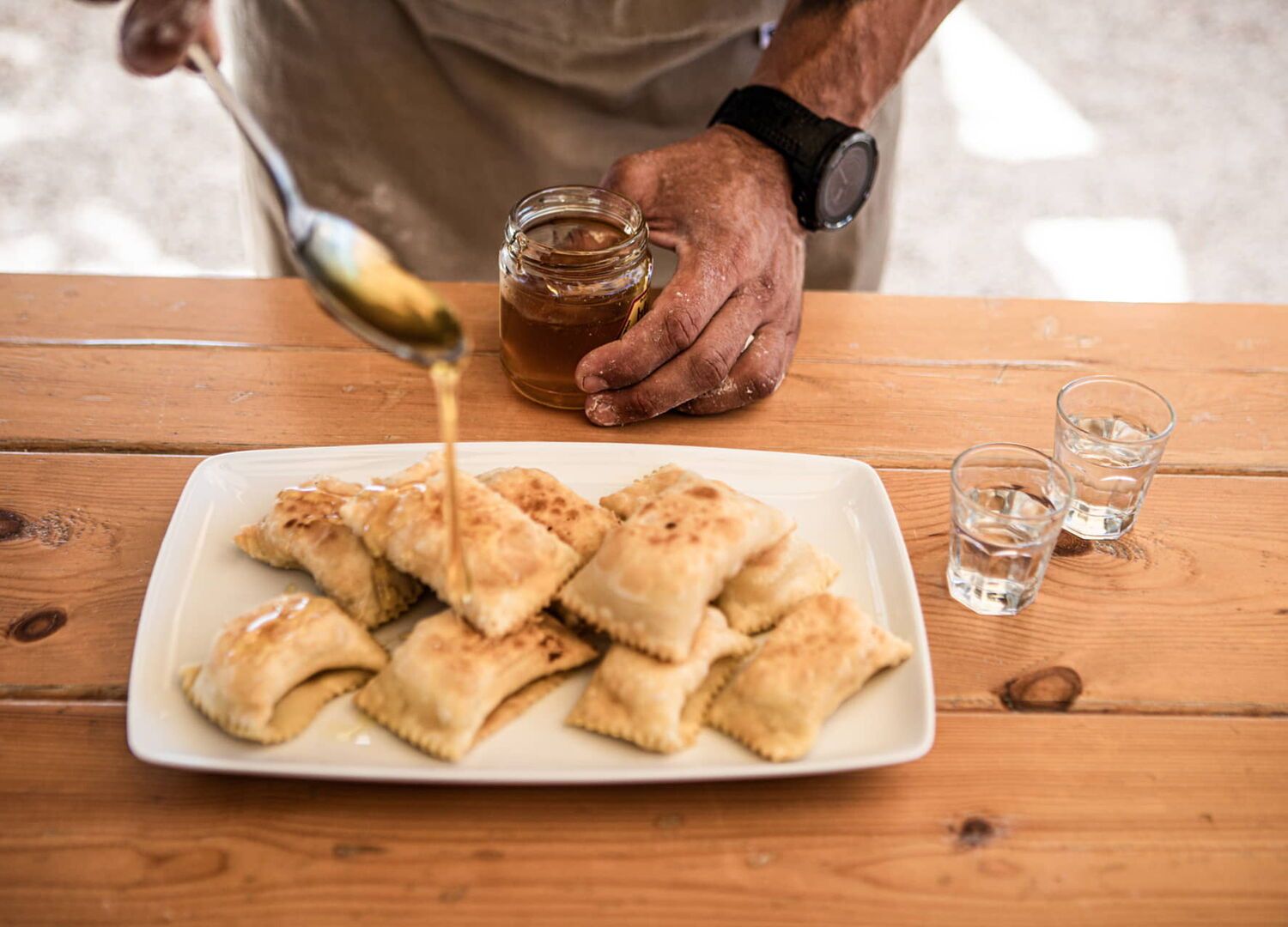 Sfakianes pites: Piccole frittelle, originarie di Sfakia, con formaggio xynomizithra e un filo di miele (sfa-kia-nès pì-tes).