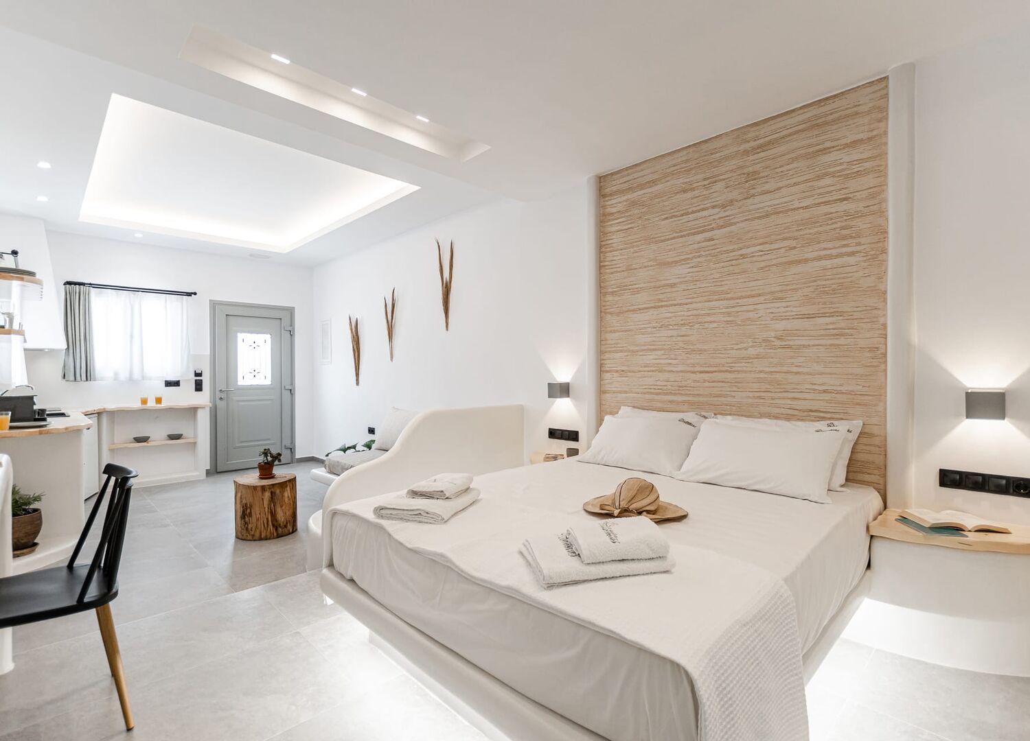 The location is about a 10-minute walk from the main streets of Chora, and there are also some shops and cafes nearby. The room is beautiful, clean, and tastefully decorated in a modern yet elegant style😍 I really loved the interior! It comes with a big TV, a small kitchen area with a sink, and a coffee machine. The bed is super comfortable, and the surroundings are quiet. I slept really well here🫶