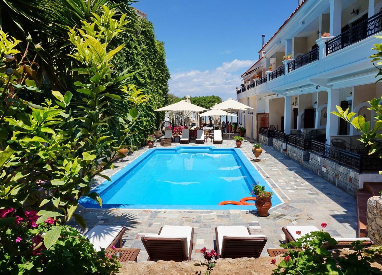 Highly recommend this hotel. Just a two minute walk from the skala port, we were able to check in early, all our heavy luggage whisked away to our large family rooms. The staff was so welcoming and accommodating, you feel truly at ease here! The rooms are beautiful and have fridges, jugs, coffee, towels were changed daily, room was cleaned daily, generous deck overlooking pool with drying rack. The beach is right outside the restaurant, just a little bit of seaweed but then there is a big sand bar, we had four kids and we felt really safe the entire time. The restaurant is amazing, all of the food was delicious and fresh. The breakfast buffet that was included with the room was full with so many homemade choices, we were very happy with that. A one point my friends son got an eat infection, the owner herself drove my friends to the doctor, they felt really taken care of and were able to mange the situation quickly. Each day we thought we would go explore other parts of the island, but honestly we were so happy just at this hotel with the beach and pool option, we ended up spending all 7 days right where we were! Highly recommend!