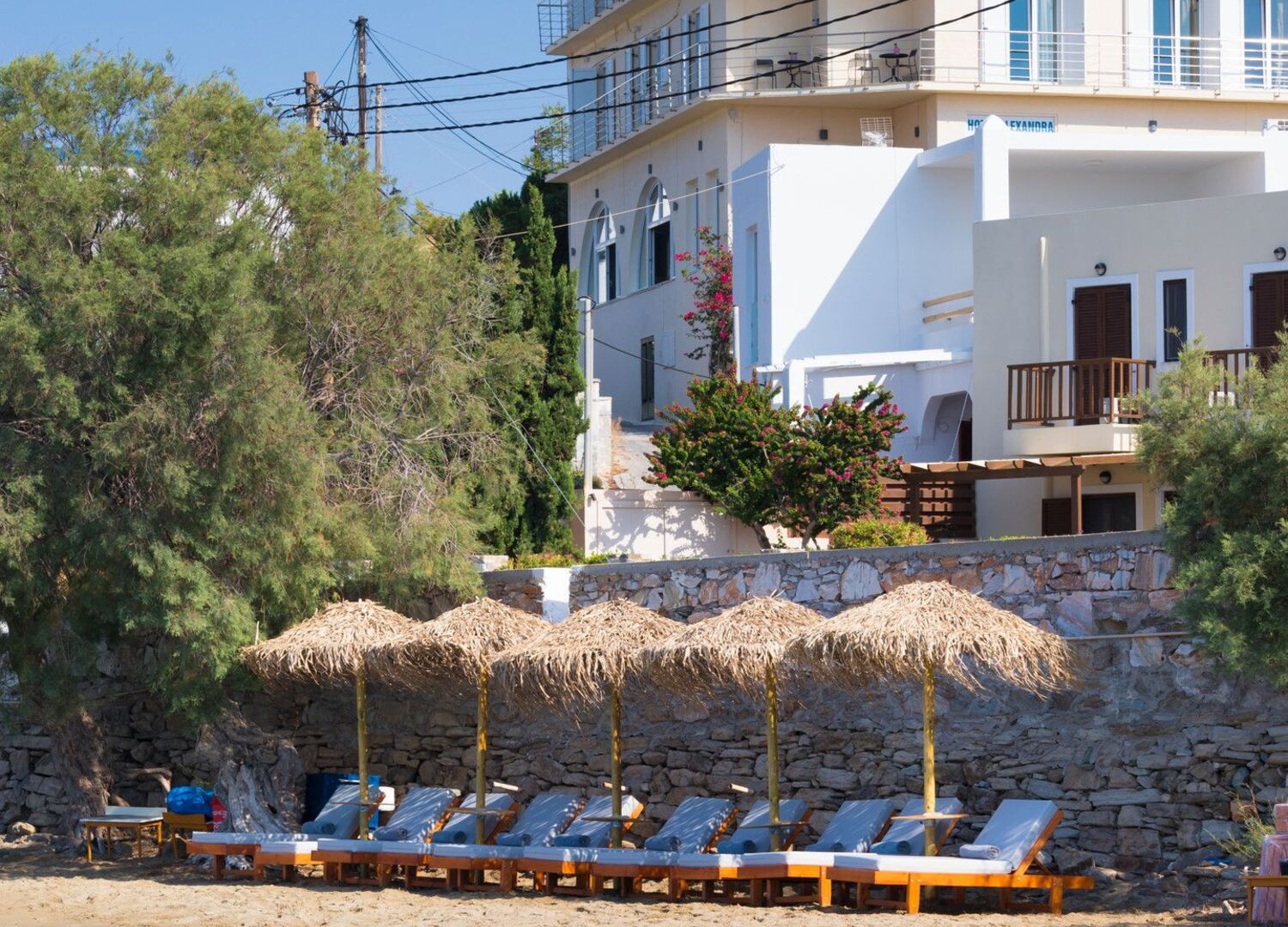 Less than 15 minutes from the ferry brings you to the pretty beach of Megas Gialos and the Alexandra hotel. Family run, with delicious breakfast and sea views. Food and beverage service their sunbeds 20m away on the beach.