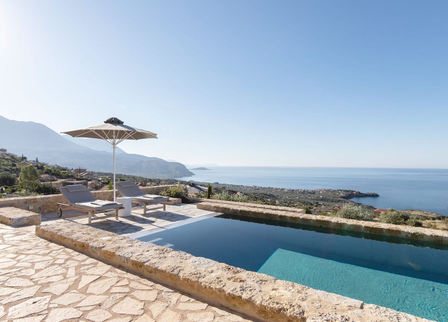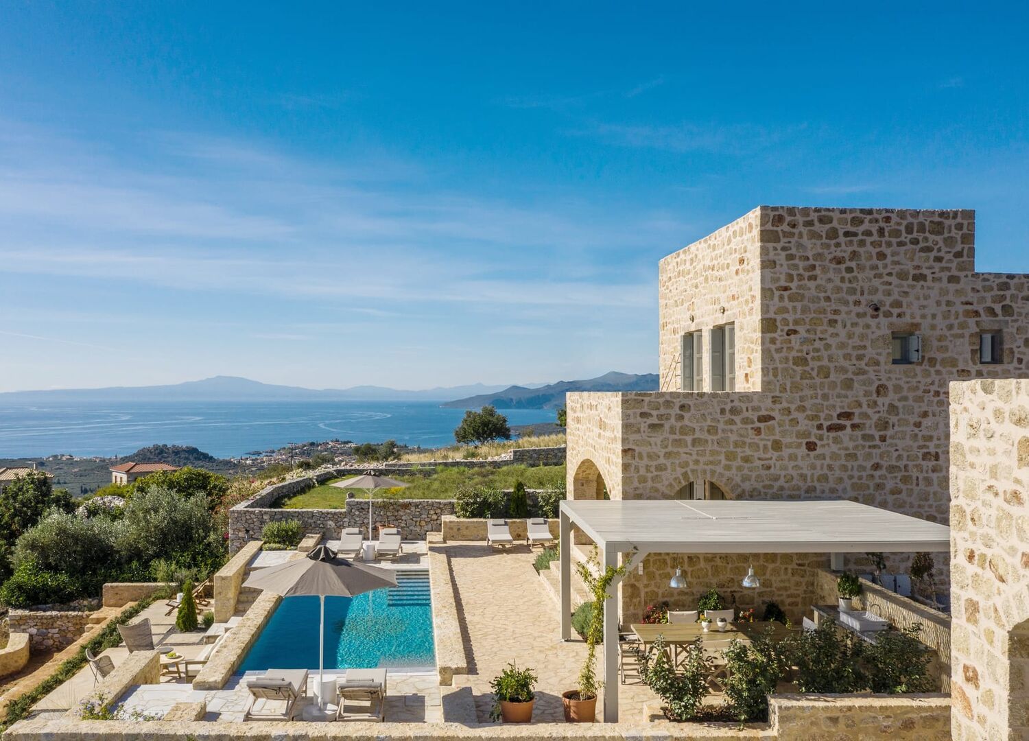 In a place where the warm colors of local stone blend with the emerald colors of the sea and the impressive property pools, -the 2020 built Amani Earthy Living-, in dialogue with the mesmerizing natural beauty of west Mani area, offers impeccable sea views of the Messinian gulf and an upscale stay in the comfort of two elegant villas.