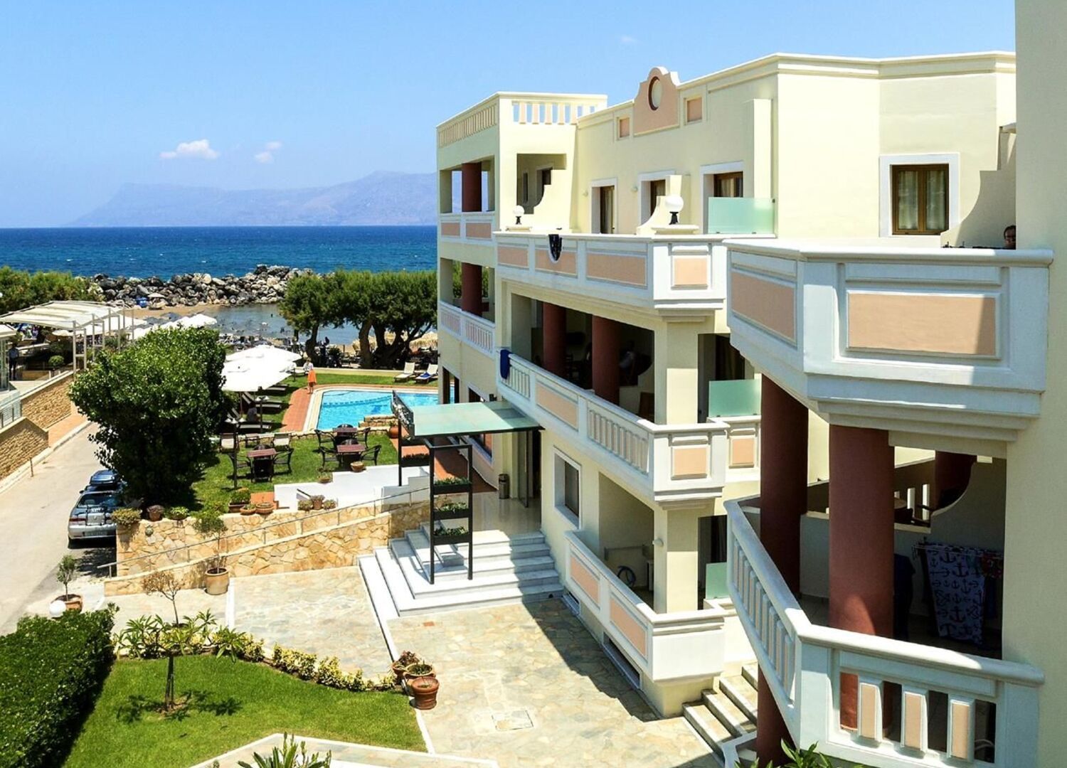Very nice place with attention to detail. The house is run by the owner and you can see that in all respects. The rooms are clean and well equipped. The breakfast buffet is traditionally Greek and varies a little every day. Good coffee and freshly squeezed orange juice are the highlights. Beautiful pool and associated sunbathing area. Direct access to the sandy beach with beautiful loungers and a beach bar, which is also run by the owner. So everything is great here as well. On your first visit, be sure to ask the owner for recommendations. The restaurants she recommended were top and her tips for excursions were also worth their weight in gold. 100% recommendation for this resort.