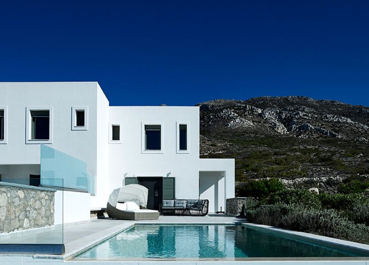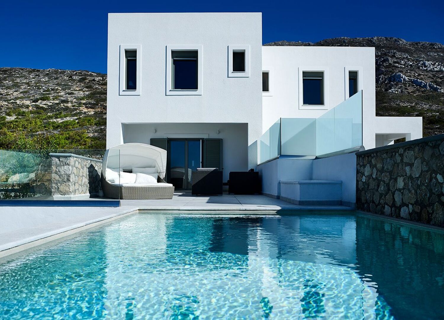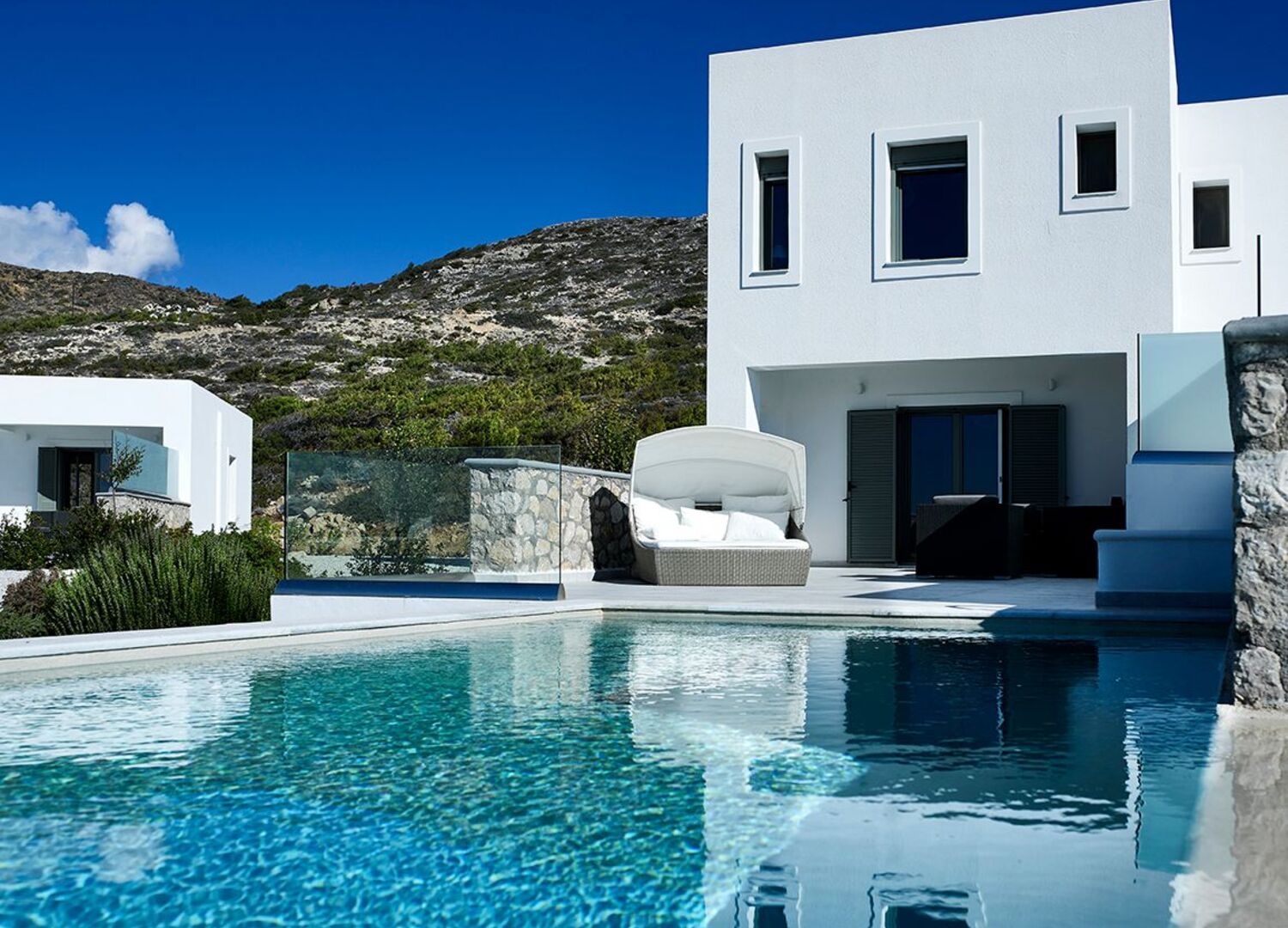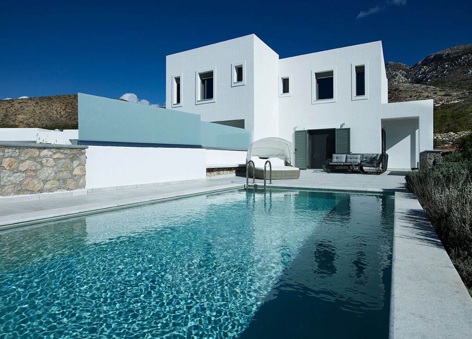 The housing complex consists of two 2-storey buildings (maisonettes), 75sqm each, and three ground floor buildings (junior suites), 50sqm each. Their minimalist architecture and their simple lines are in complete harmony with the natural landscape and the traditional architecture of the island. Each house has its own private pool (with overflow) and a terrace with unobstructed view to the sea and the vastness of the horizon, along with a private parking area.