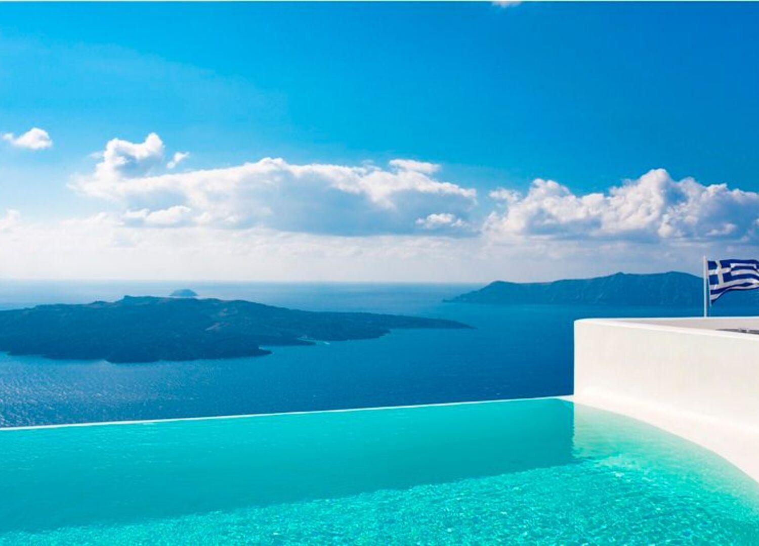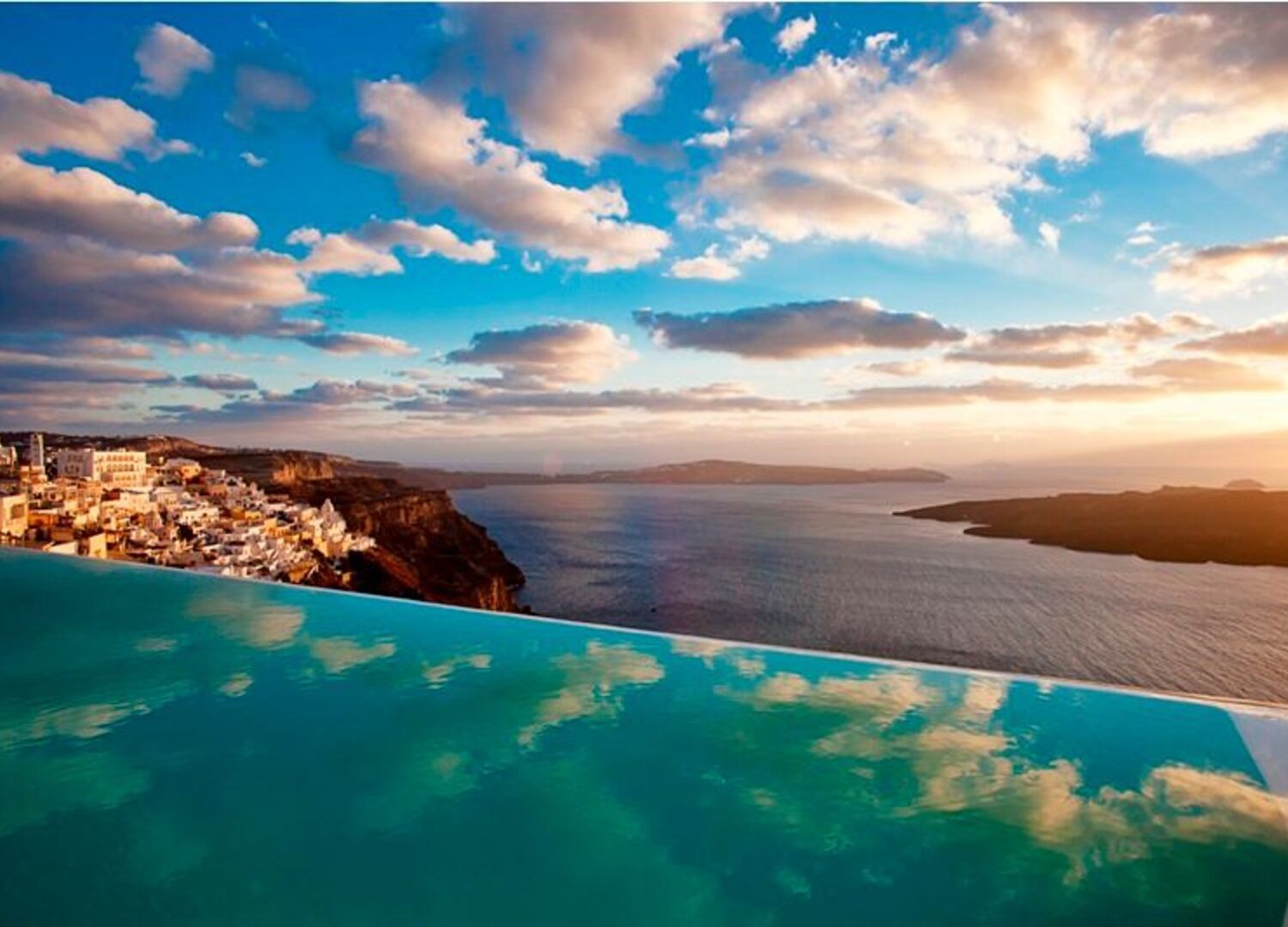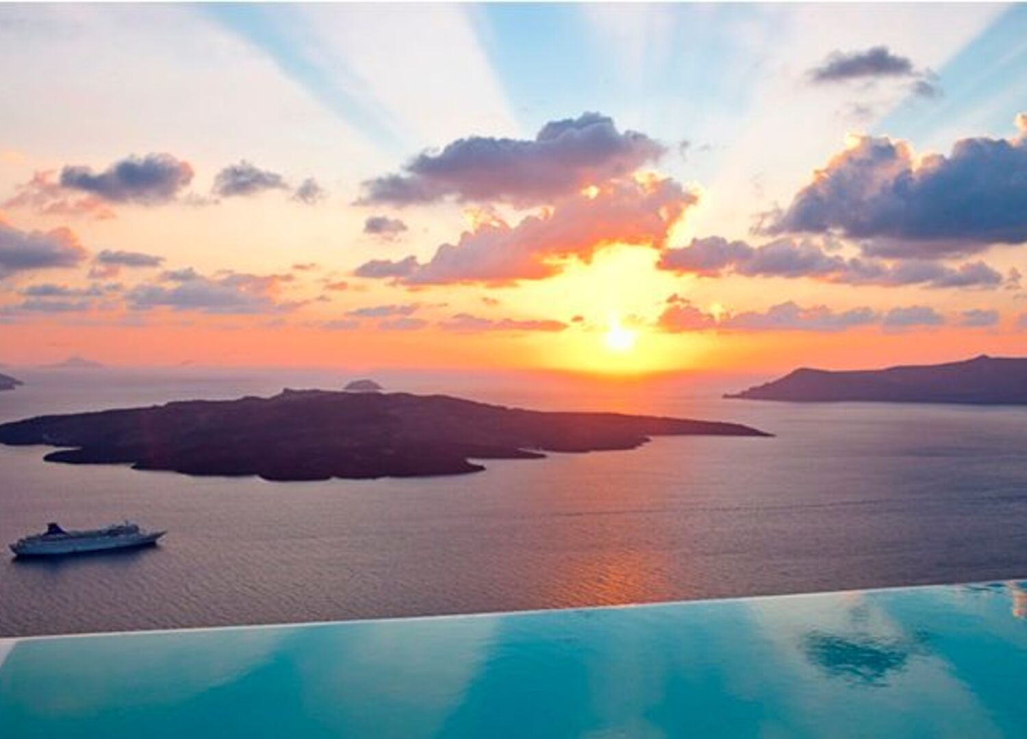 A discrete entrance leads to one of the most elegant and serene hotels of Fira Town; with its pristine Cycladic grace and the infinity pool that hangs from the cliff, Cosmopolitan Suites stands out among other hotels as the one with the most impressive views to the black volcano and the surrounding architectures falling like white and blue pearls to the Caldera basin.