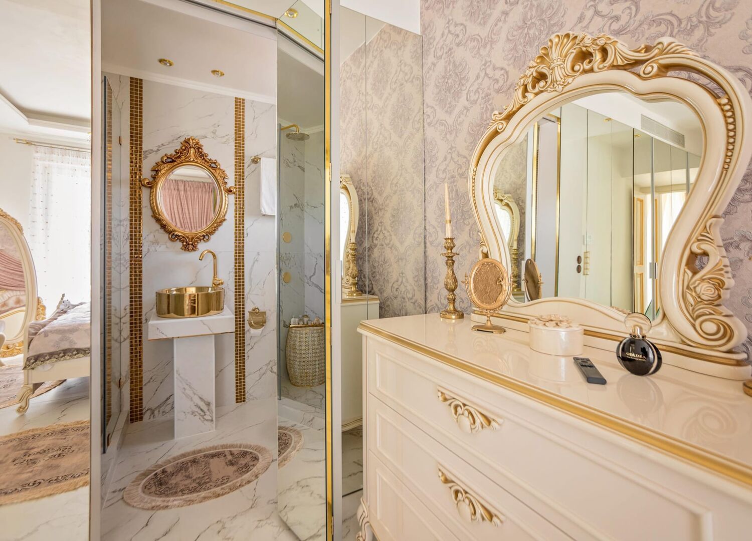 Our Royal Suite boasts a large King Size bed, en suite bathroom with hydromassage, walk-in closet, and it’s outfitted with turkish carpets, richly patterned wallpapers, silk and velvet linings in perfect combination with the crystal chandeliers.