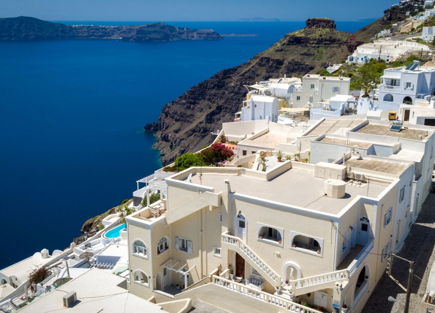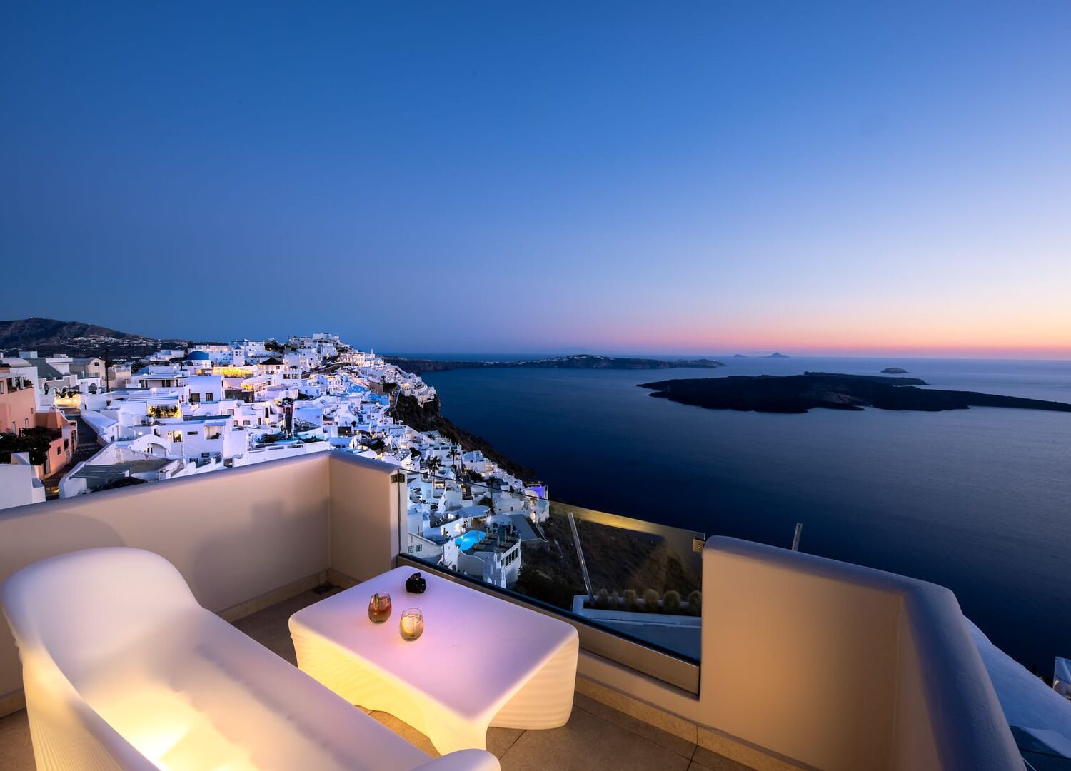Towering high above the Caldera of Santorini, the most breathtaking view of the island, Damigos Caldera World lets you enjoy the mythic atmosphere of a Caldera Sunset directly on your private balcony. Regularly praised for its impeccable service, elegantly appointed suites and vibrant atmosphere, guests are invited to enjoy the spectacular views of Sunsets and Caldera, admiring unique landscapes that will surely steal their hearts. Damigos Caldera World is superbly located and it is merely a few minutes away from the main city of Fira: the famous capital of Santorini, full of restaurants, shops, jewelleries and night clubs suitable for all clientele's needs.