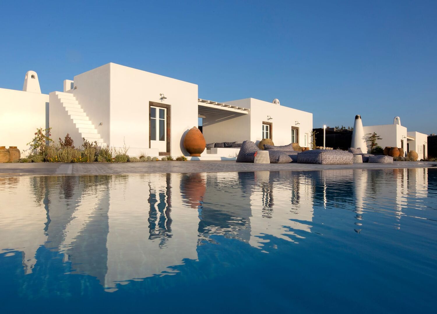Three suites feature varied one-bedroom layouts, with easy open floor plans and gracious indoor and outdoor living areas that are easily adapted according to guests’ specific needs. A separate two-bedroom bungalow, adjacent to the Estate’s spa facility, offers even more flexibility. Acclaimed international interior designer Paola Navone has brought her sophisticated Aegean aesthetics, using a color palette based on whites and dark grays splashed with colors reflecting the sea and the blooming landscape, inviting the warmth and serenity of the outdoors into each room. Walls are inlaid with local stone, in irresistibly rustic contrast to luxurious fabrics by Rubelli of Venice and bath fixtures by Stella of Italy.
