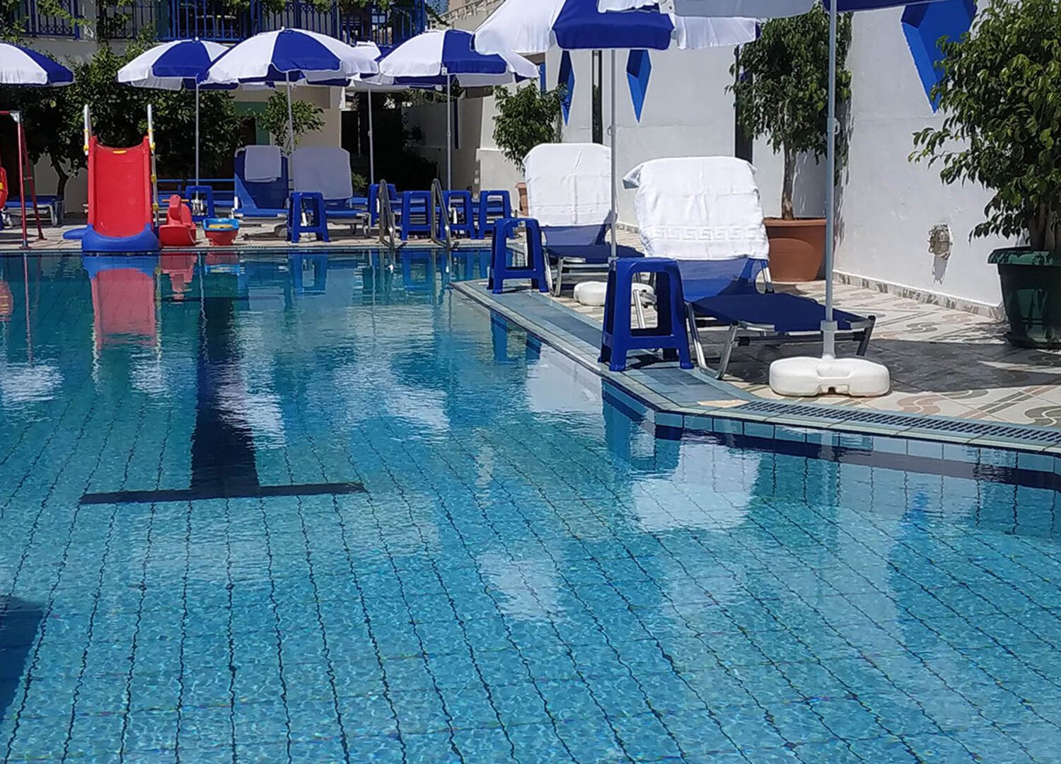 The rooms have views to the sea, pool or mountain. In the price of the room are included the following: 1) Aircondition 2) Safe deposit box 3) Swimming pool, sunbeds, umbrellas and children toys 4) Room cleaning, 5) Bed sheets, pillow cases and towels regular change, 6) Flat screen 40 inches brand new smart TV , 7) Iron and ironing board, 8) Hairdryer, 9) Coffee machine and toaster, 10) Baby cot suitable for up to 2 years old child.