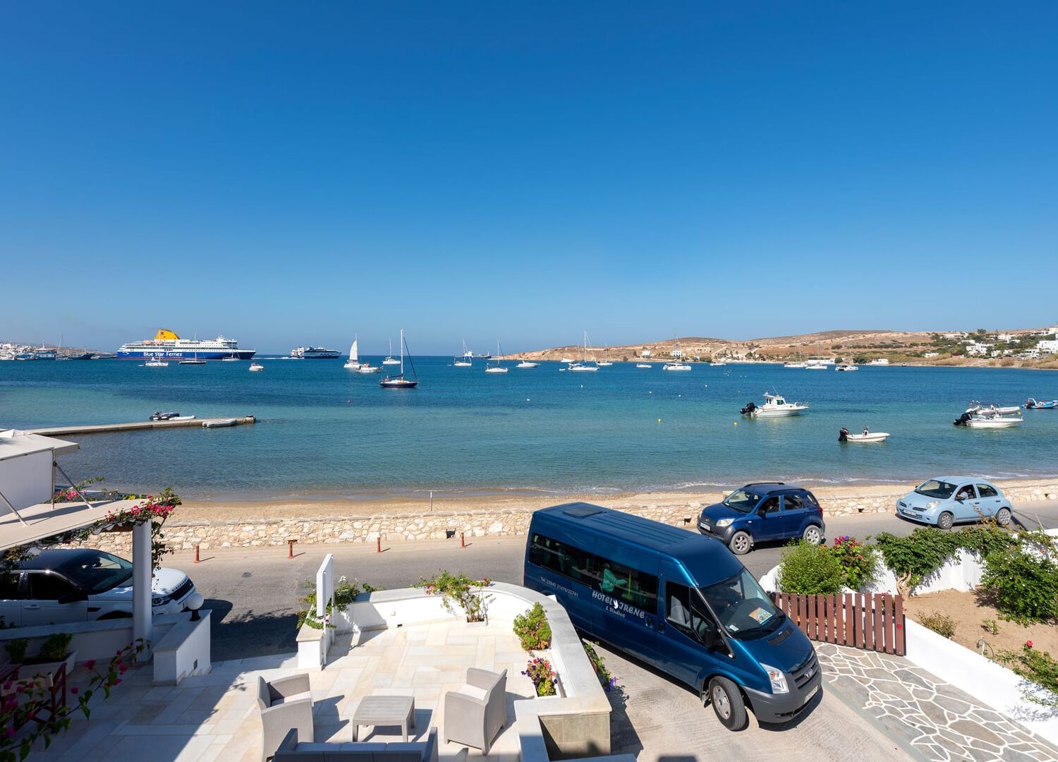 Beautiful hotel across the road from beach. Room was very clean and comfortable and hotel is walking distance to shops and restaurants, very quiet at night. Breakfast was a real treat cooked by the wonderful Irini. We were given a complimentary bottle of wine made by Irini and her husband as well as a beautiful home baked cake. Amazing view from our balcony to the port, the sea and other side of the island. Irini and her daughter were marvellous hosts and nothing was too much trouble. Would definitely recommend this hotel and would return again.