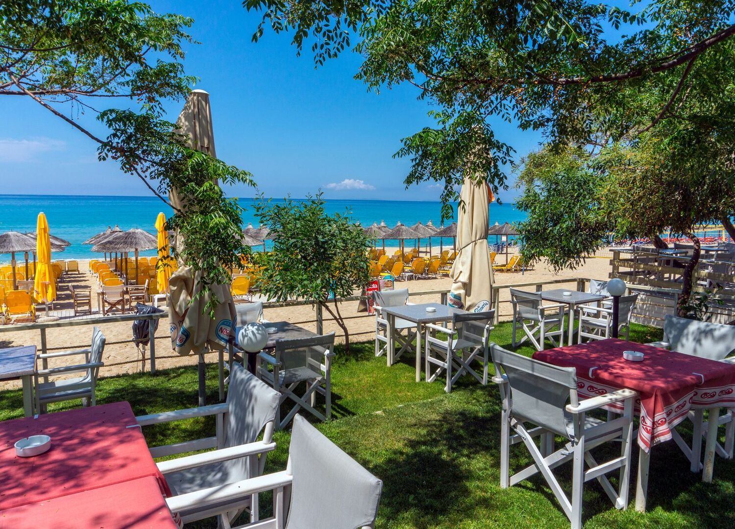 Breakfast, coffee and drinks are served at the Loukas café-snack bar, offering lovely views of the Ionian Sea. Fresh fish, homemade local dishes, as well as Mediterranean cuisine can also be enjoyed at the hotel's restaurant for lunch or dinner. On the beach there are sun beds and umbrellas, as well as a beach volleyball court and watersport facilities.