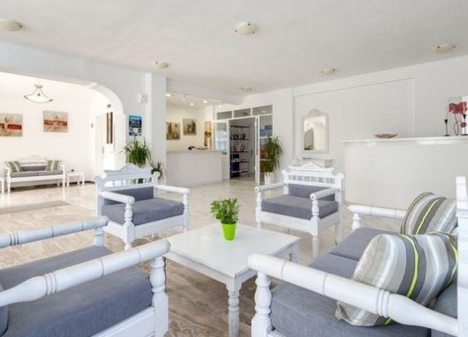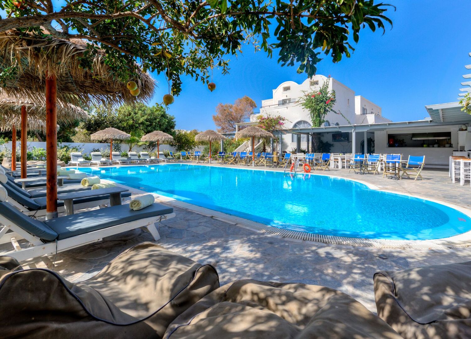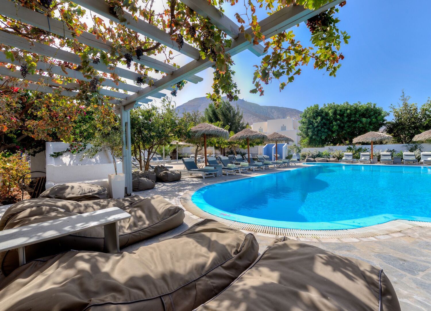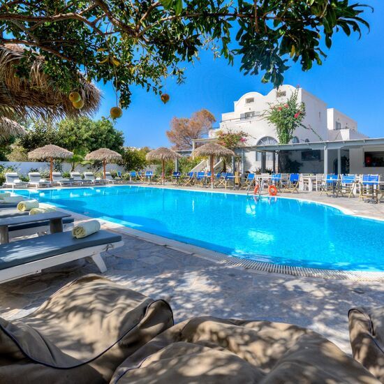 Set in a quiet location with an attractive pool area and a small garden with a view towards one of the island's many blue and white churches and the mountain of Mesa Vouno with of Ancient Thira