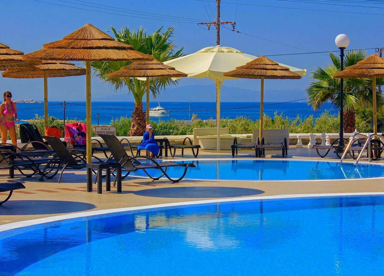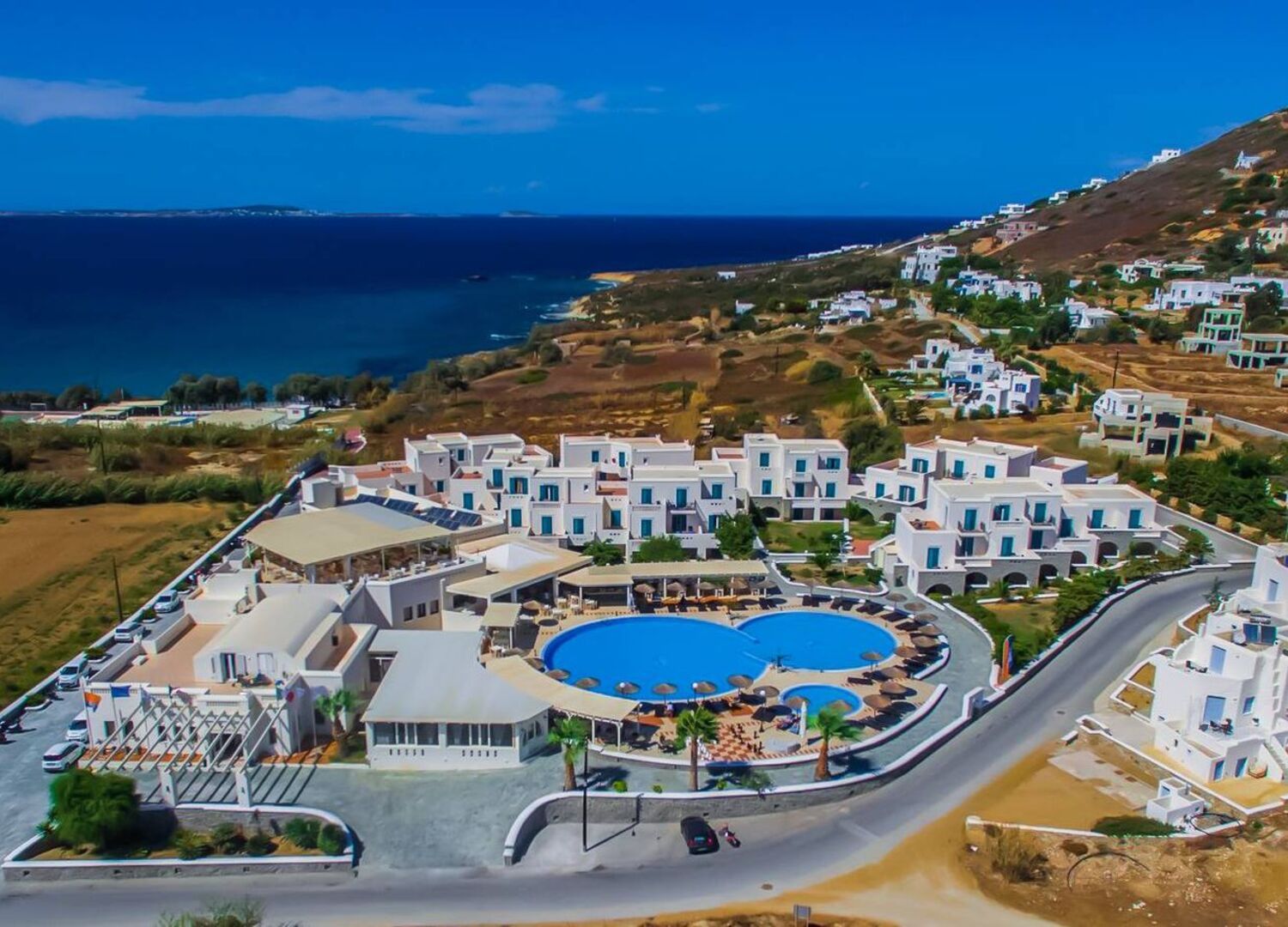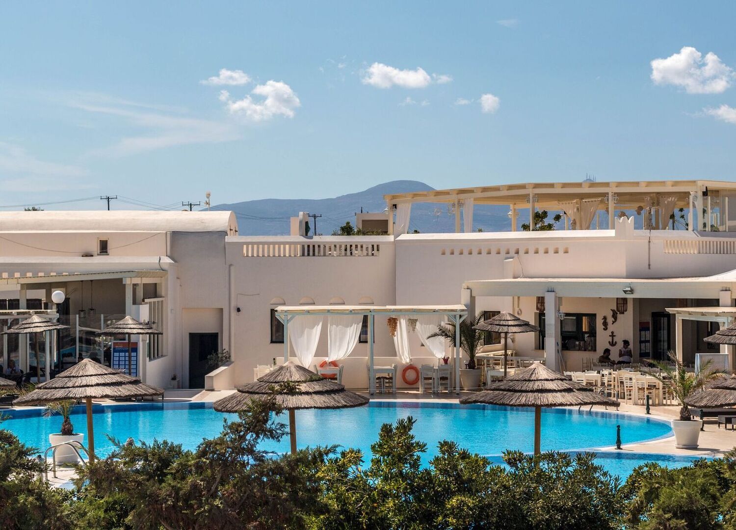 The hotel is situated at 4 km distance from the port and from Chora, the capital of the island, and only 2 km distance from the airport. By walking fifteen minutes, nearly nine hundred meters you can also find other tourist villages.
