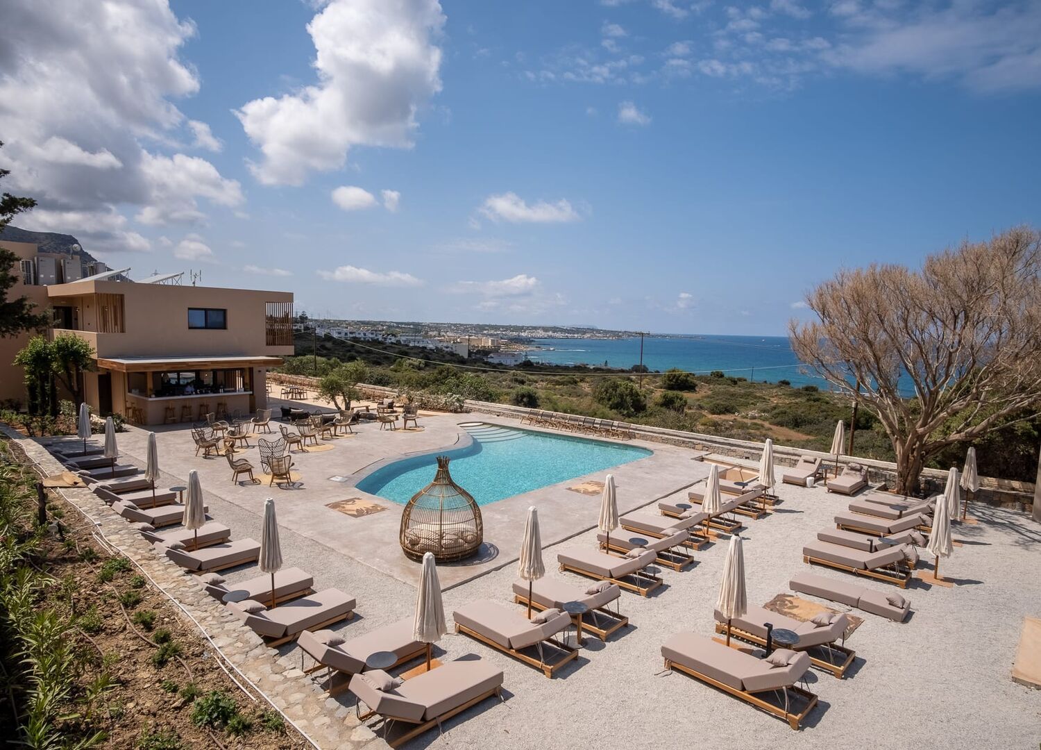Nestled amidst lush, exotic greenery, The Nest Resort is perfectly situated on a rocky, ascending cliff, offering breathtaking panoramic views of the crystal-clear waters of the Aegean Sea. Beautifully located on Crete’s northern coastline, near the charming town of Hersonissos, The Nest features a collection of newly renovated, elegant villas, each boasting an unparalleled sea view and a private pool, as well as some contemporary, laid-back chic guestrooms.