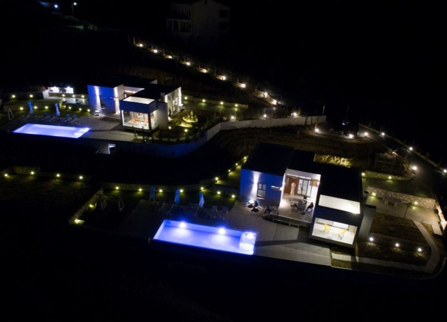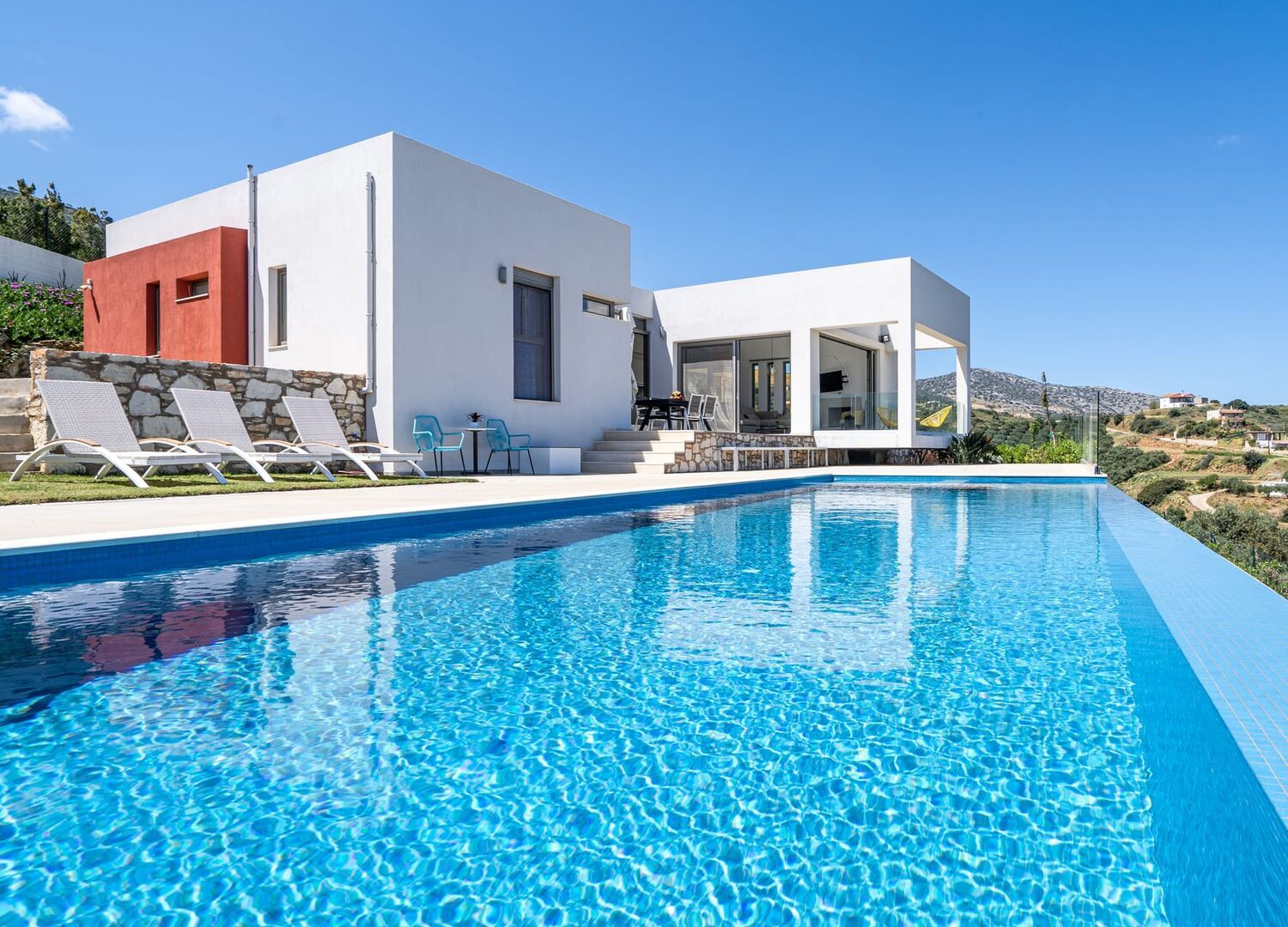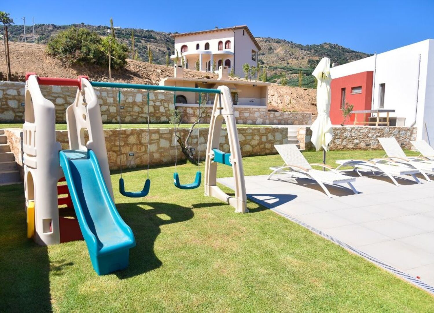 Sea View Villas Crete is a stunning accommodation located in the beautiful bay of Agia Pelagia on the island of Crete. The villas are designed to blend in with the Cretan environment and offer breathtaking views of the Aegean Sea. Each villa features a spacious living room, kitchen, three bedrooms with open baths, and access to surrounding gardens with a large swimming pool and children's playground. The address for Sea View Villas Crete is Crete - Heraklion - Aghia Pelagia.