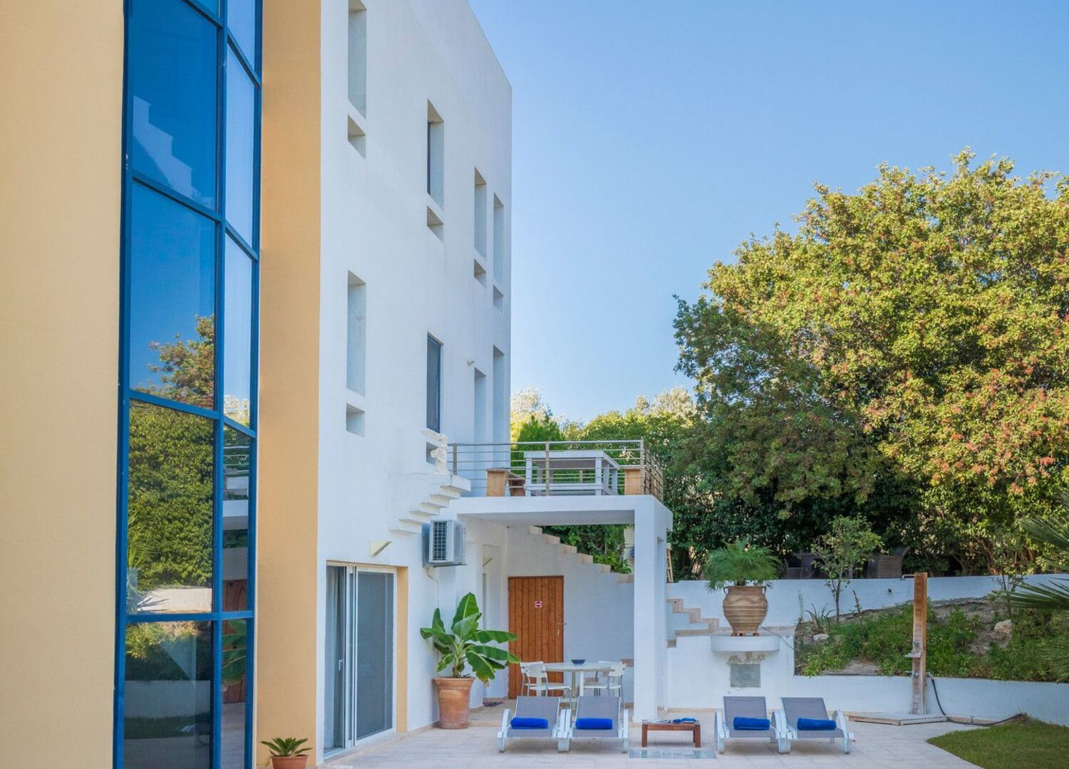 In a peaceful neighborhood at beautiful Ixia of Ialysos, just a few kilometers away from the center of Rhodes lies Themis Private Villa. The villa offers smooth access to nature, as it nestles near the imposing Filerimos mountain, where you will enjoy strolling up the hill and gazing at stunning panoramic views of the Aegean Sea from its top. Surrounded by a large beautiful garden and a lush green lawn full of trees, the three-floored villa comprises five luxury suites, perfect for families or a group of friends.