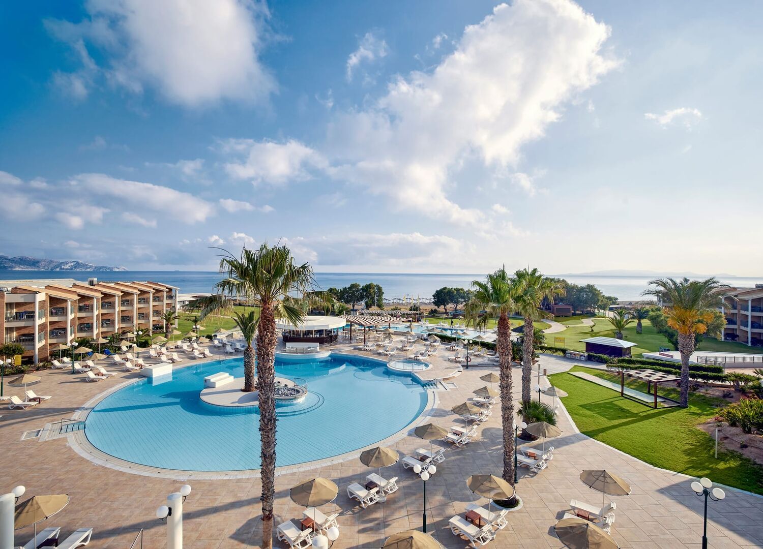 The resort features 320 rooms and suites, including 59 units set in gardens near the beach, some with private pools. Rooms are equipped with modern furnishings, satellite TV, internet, a safe, and a hairdryer, with options for Garden, Side Sea, and Sea Views.