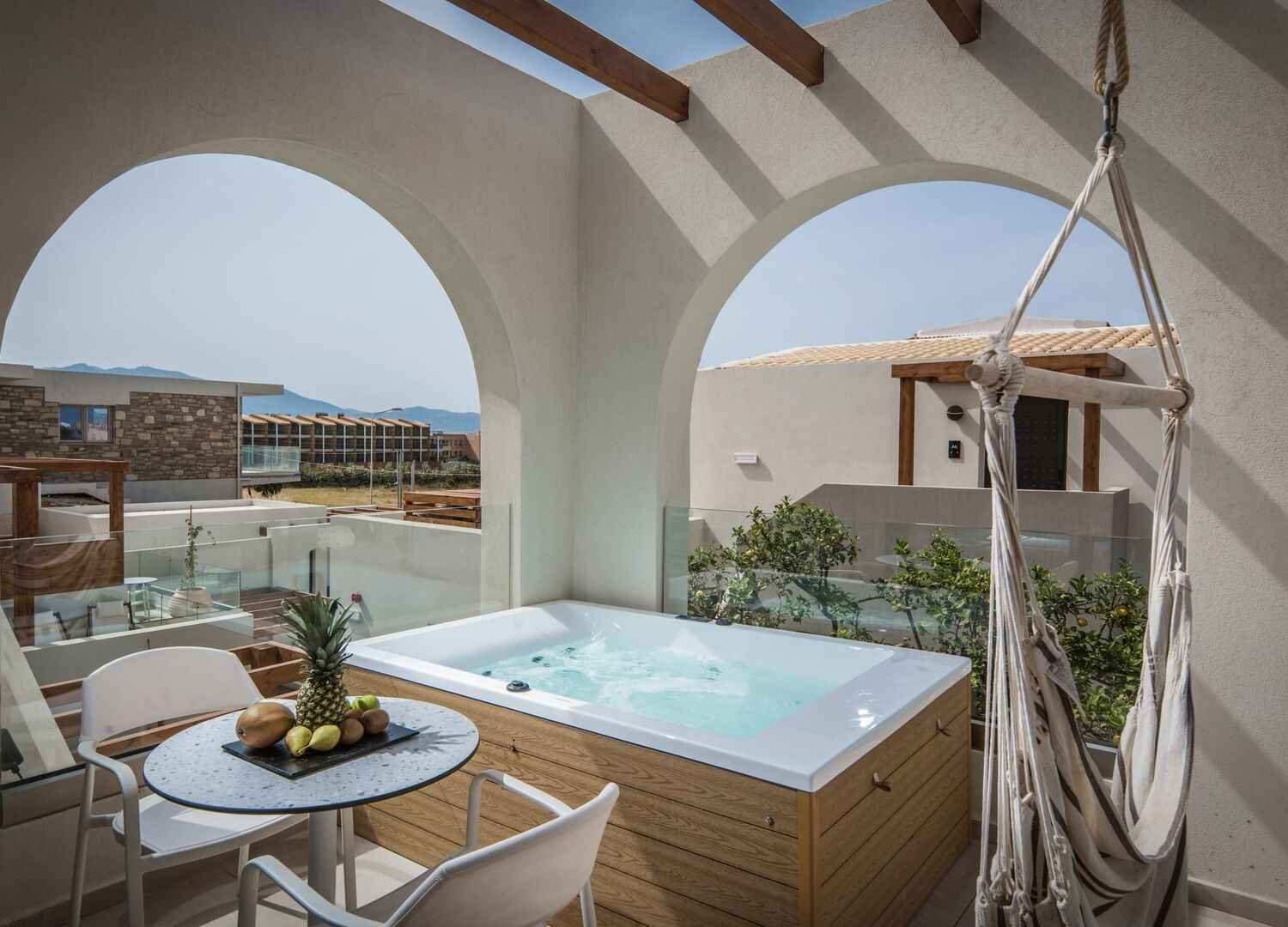 Our home away from home for 16 days. We had the 2 room suite on the ground floor. This upon our own request as we try to avoid cigarette smoke drifting in, knowing that smoking is still a widespread habit in Greece. We were very happy with our rooms. The living room was spacious with a neat little pantry tucked in. The pantry had a small fridge and a two spots electric cooker, there were some pans and enough crockery and cutlery for 2 persons. We used it to cook our breakfast. The bedroom held a nice double bed and had a ceiling fan to move the air around. The living room had an aircon and we usually left the door between the two rooms open to enjoy the cooler air. The bathroom was clean with nice vanity with sink, a toilet and really nice rainshower with lots of water pressure. Outside our living and bedroom we had a very spacious terrace with a jacuzzi. One we used nearly every single day. Suffice to say we thoroughly enjoyed our stay. The times we had questions or needed help, the staff were friendly and very accommodating. Last but not least we were able to park our rental car within the apartments’ grounds. Added bonus, the beach was a 5 minute walk away.