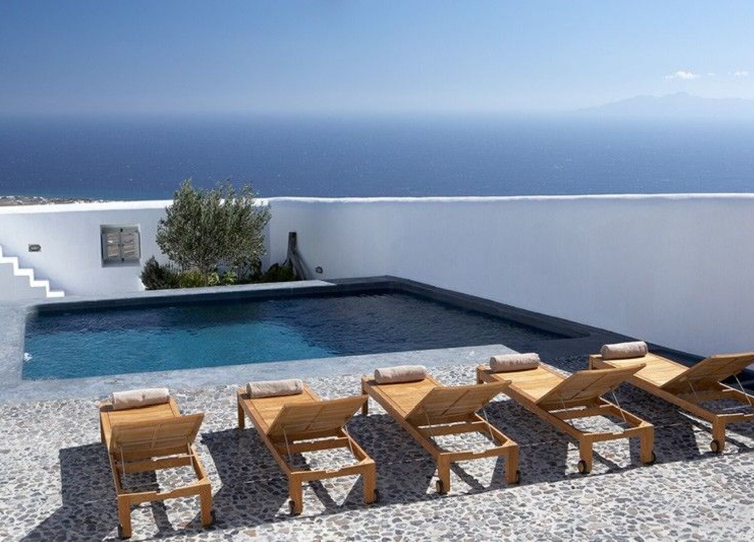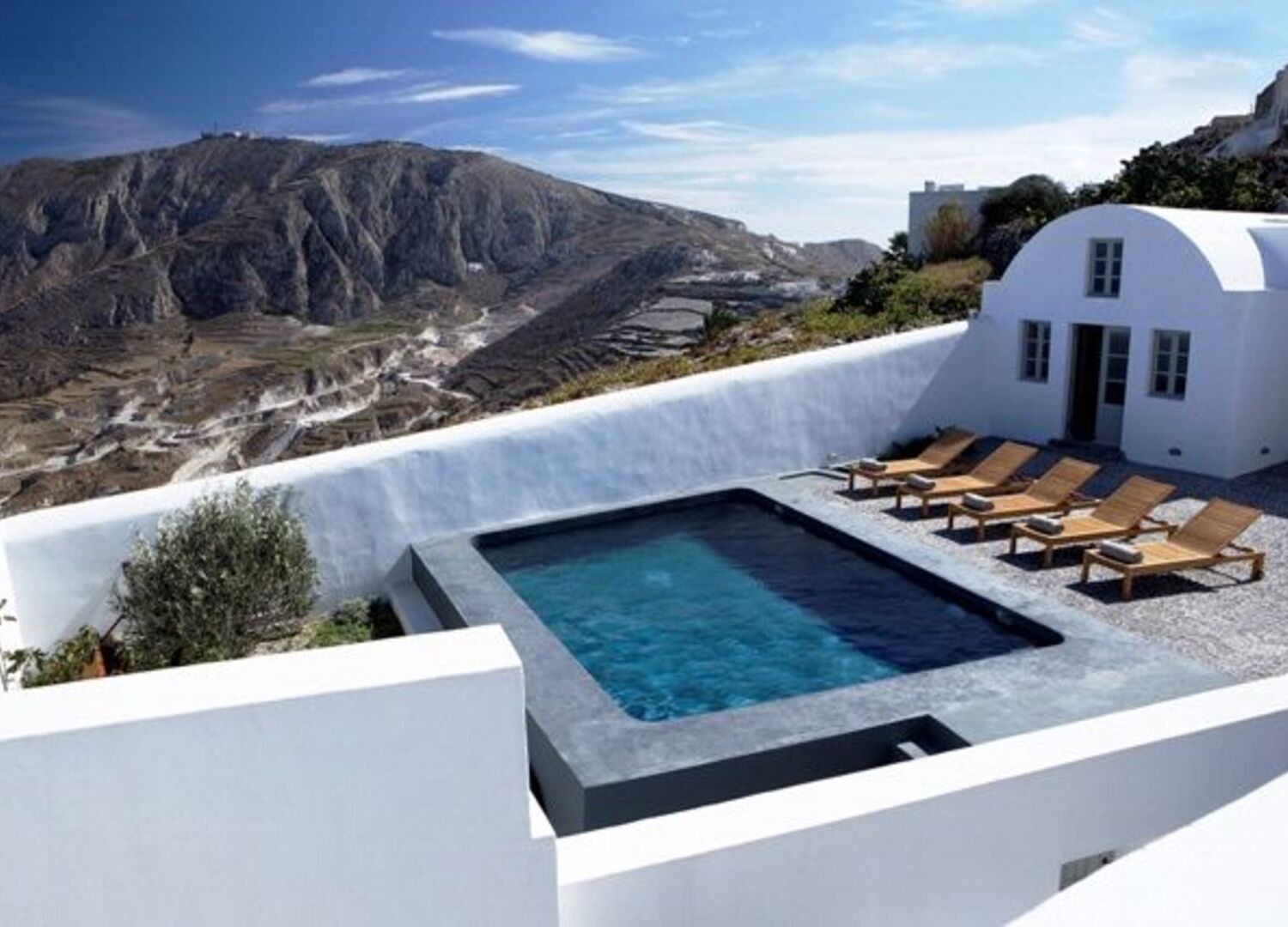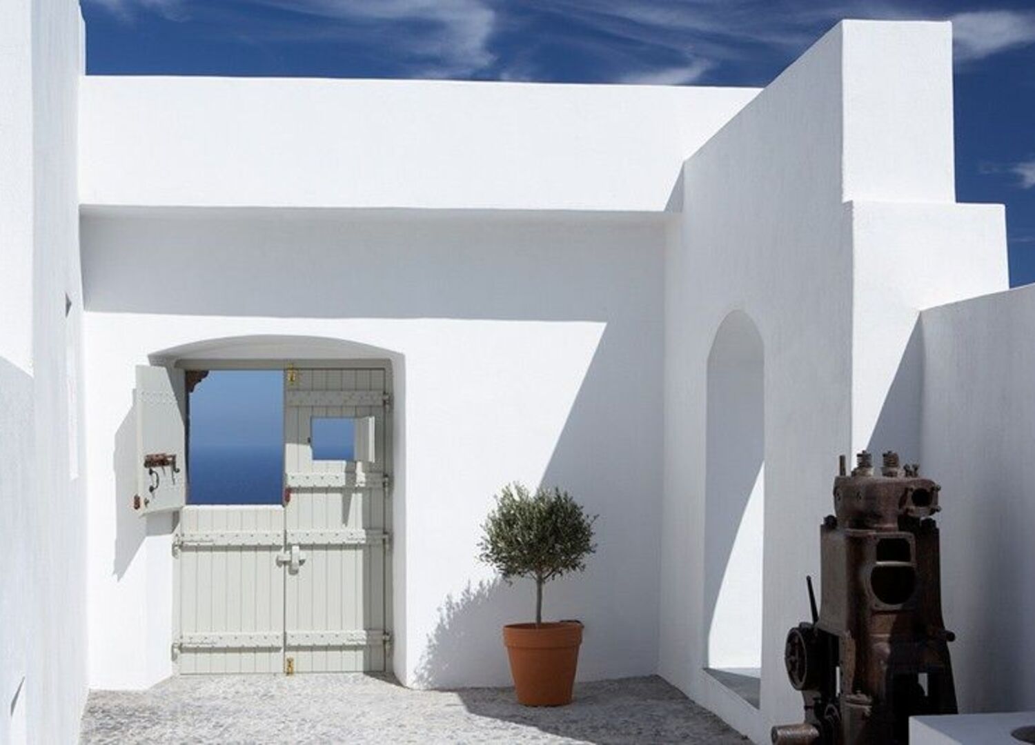 The property has a very sleek and minimal loft-style design, and has been restored with a deep understanding for its traditional Santorini architecture using the old style of polished cement and eco-friendly materials. Elements of the factory have been incorporated into the design, and a huge piece of machinery stands like a magnificent sculpture as the centerpiece of one of the numerous living spaces. The restoration project took years of meticulous research, as Fabrica is located just underneath the historically important Castle of Pyrgos. The floors were painstakingly created by a local craftsman, who mixed colors and cement to create the beautiful matte finish throughout. Santorini is famous for her organic Cycladic architecture, but it’s not every day you get to experience one like this. You have to stay here – to live in it and breathe in it – to fully appreciate the splendor of Fabrica’s high ceilings and natural light. The villa boasts generous outdoor space: with two impressive pool terraces and various additional alfresco arrangements, you will be spoiled for choice in finding your perfect spot to lap up the Greek sunshine.Care and attention has been lavished on this home to make sure everything is stylish and luxurious without being fussy. It offers unbeatable comfort and effortless elegance for what is truly a one-of-a-kind luxury villa. Due to its layout, Fabrica can be split into two totally separate and private villas, or hired as a whole – a truly knockout retreat for an unforgettable wedding or a big family reunion. We also host week-long spa retreats and cooking schools off-season.