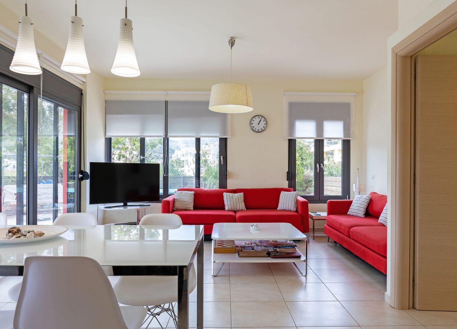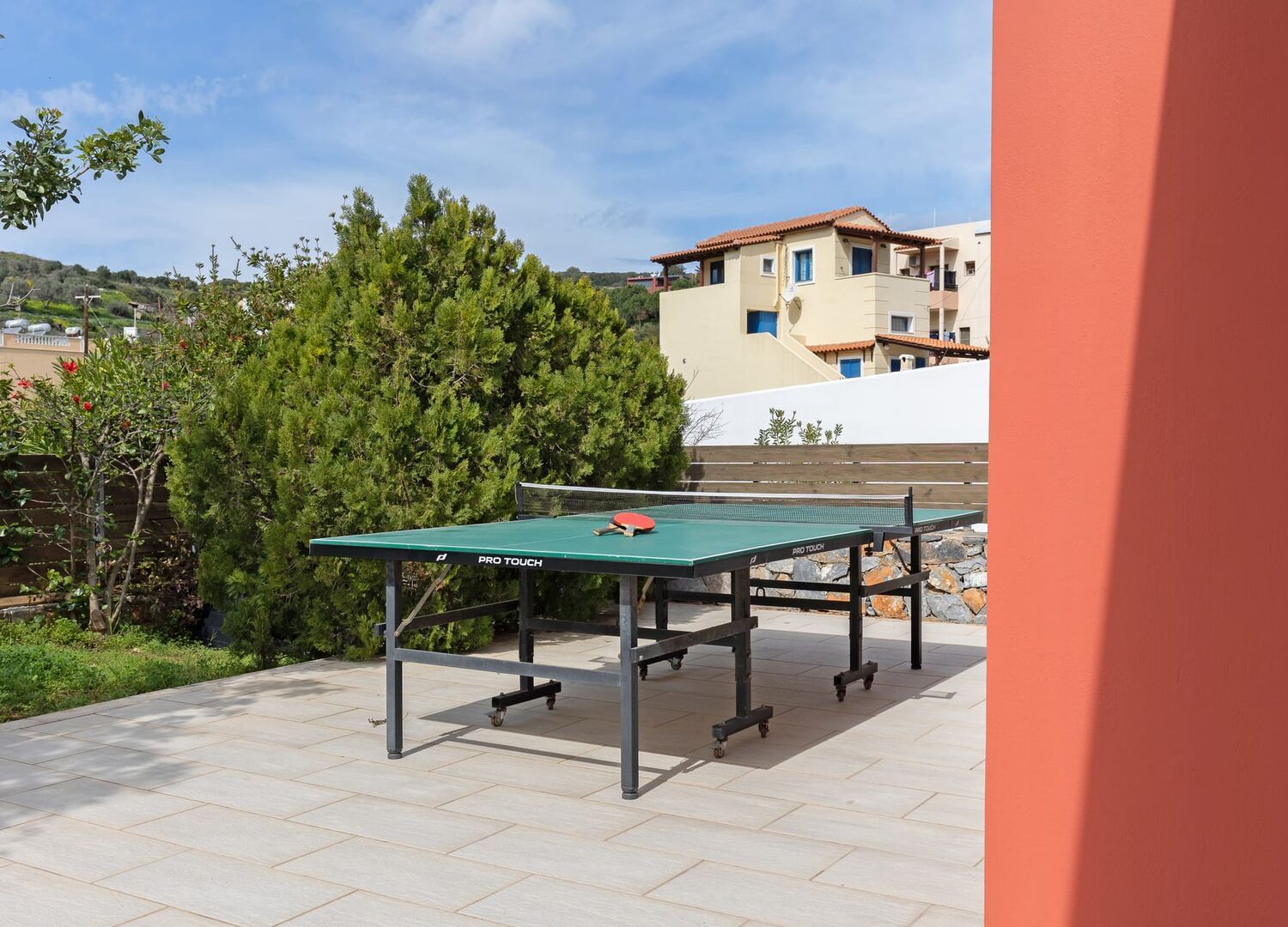 Outside, a large yard beckons with inviting sun loungers and a spacious pergola hosting an outdoor dining area, perfect for enjoying meals in the refreshing island breeze. Entertainment awaits with a ping pong table and an assortment of board games, ensuring endless family fun.