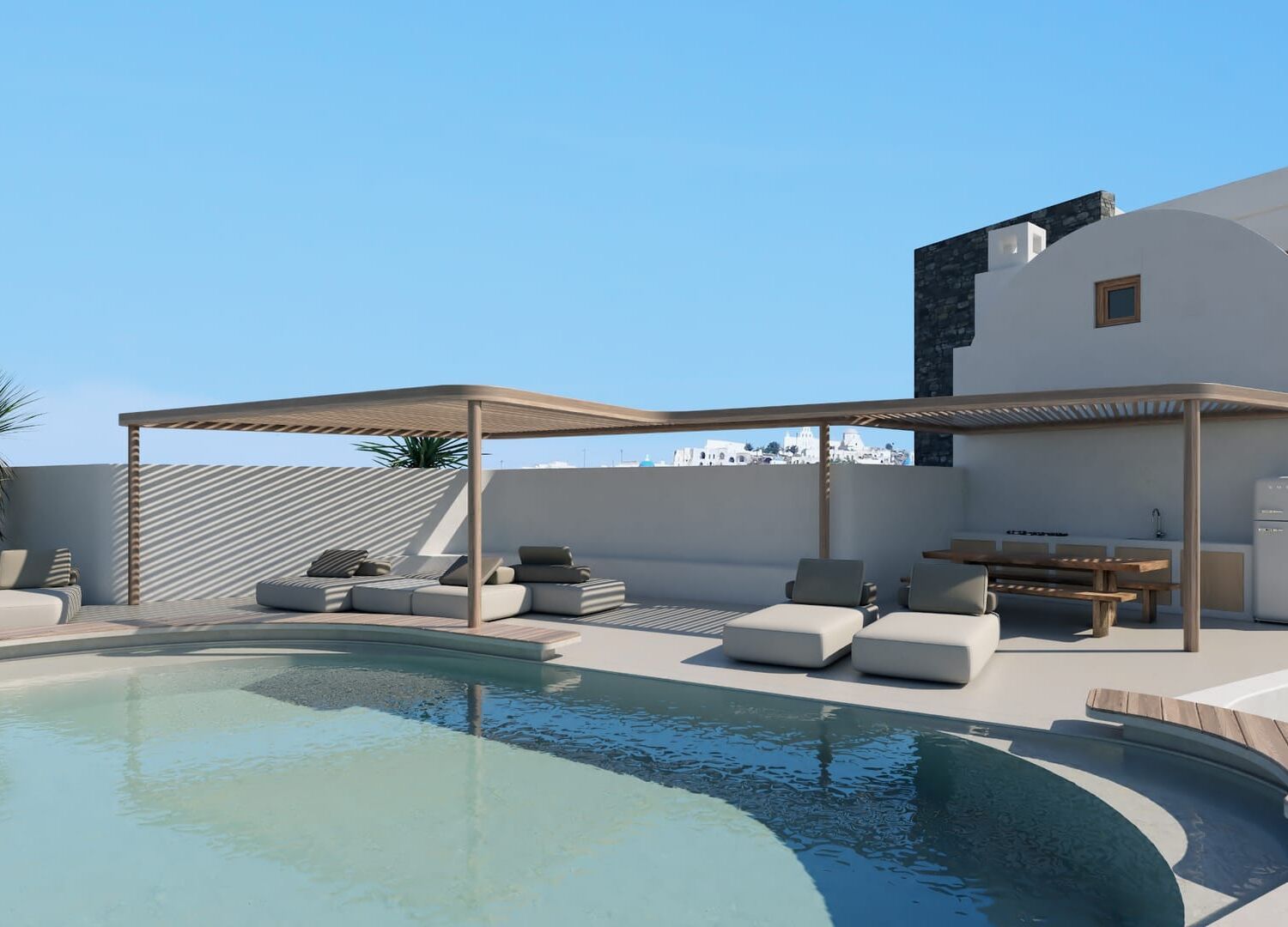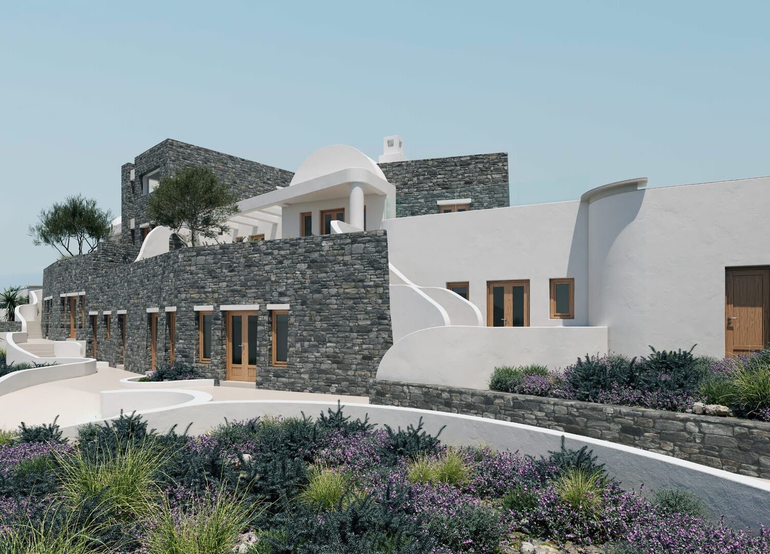 Inspired by the Cycladic architecture and designed with an elegant and soothing aesthetic of neutral tones and using a mix of natural materials, including wood and polished cement mortar floors, the villas exude a sense of tranquillity as light floods the rooms and breezes flow through the villa, capturing the essence of the island.