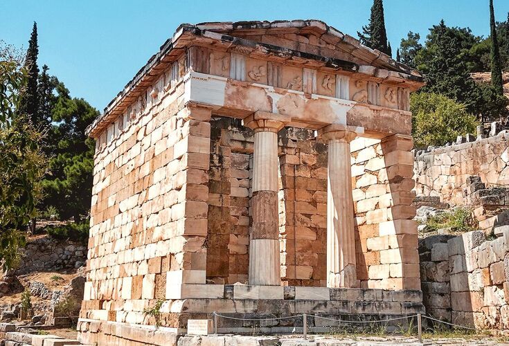 The archaic temple of Apollo was constructed in 510 B.C. with money raised by many Greek cities under the auspices of the Alcmaeonids of Athens. When this temple was destroyed by an earthquake in 373 B.C., the Greek cities collected money again and built the extant temple, which was accomplished in ca 330 B.C. It was a Doric peripteral temple with a vestibule and an opisthodomos distyle in antis. In the cella was situated the statue of the god and the omphalos (navel of the earth), whereas in the vestibule were inscribed the Delphic maxims of the seven wise men of Ancient Greece.