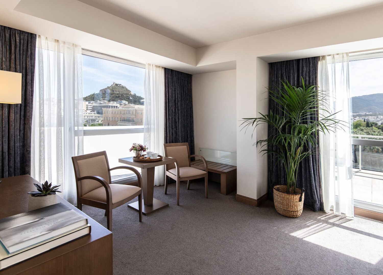 Excellent location when visiting Athens. Located within walking distance to all major sites. Staying here we were able to walk around everything we wanted to visit. The rooms were nice, amenities were great. Rooms provided robes, slippers, toiletries, safe, hair dryer and a stocked mini bar and snacks for extra cost. Which was nice for a late night snack. We loved the breakfast that was included in the stay. They had a wonderful breakfast dining area and a great selection of breakfast foods from authentic Greek to eggs, bacon, pastries, etc. They also have a wonderful rooftop restaurant which is a nice upscale restaurant overlooking the Acropolis. It is enclosed and does not have outdoor seating.