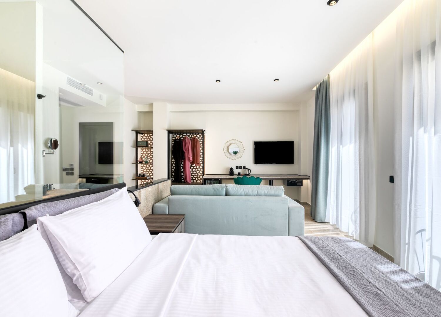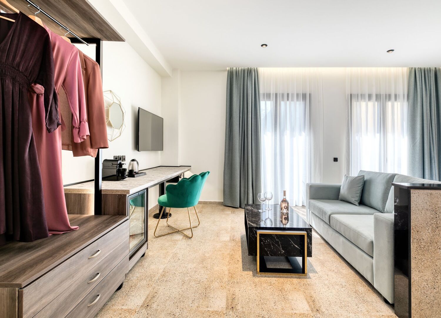 All our rooms combine classic architecture with modern and contemporary aesthetics, a result of the work of young Greek architects and renowned artists. In all rooms there are large double balcony doors that lead to furnished balconies offering a wonderful view of either the magnificent Acropolis from the side of Mitropoleos Street or the beautiful small pedestrian street of Petraki. Each room offers the latest technology and modern design equipment, such as 40'' Smart LED TV, high speed Wifi fiber optic network, Bluetooth Marshal speakers, Nespresso coffee machines, comfortable COCO-MAT mattresses and natural personal care products of Zealots of Nature.