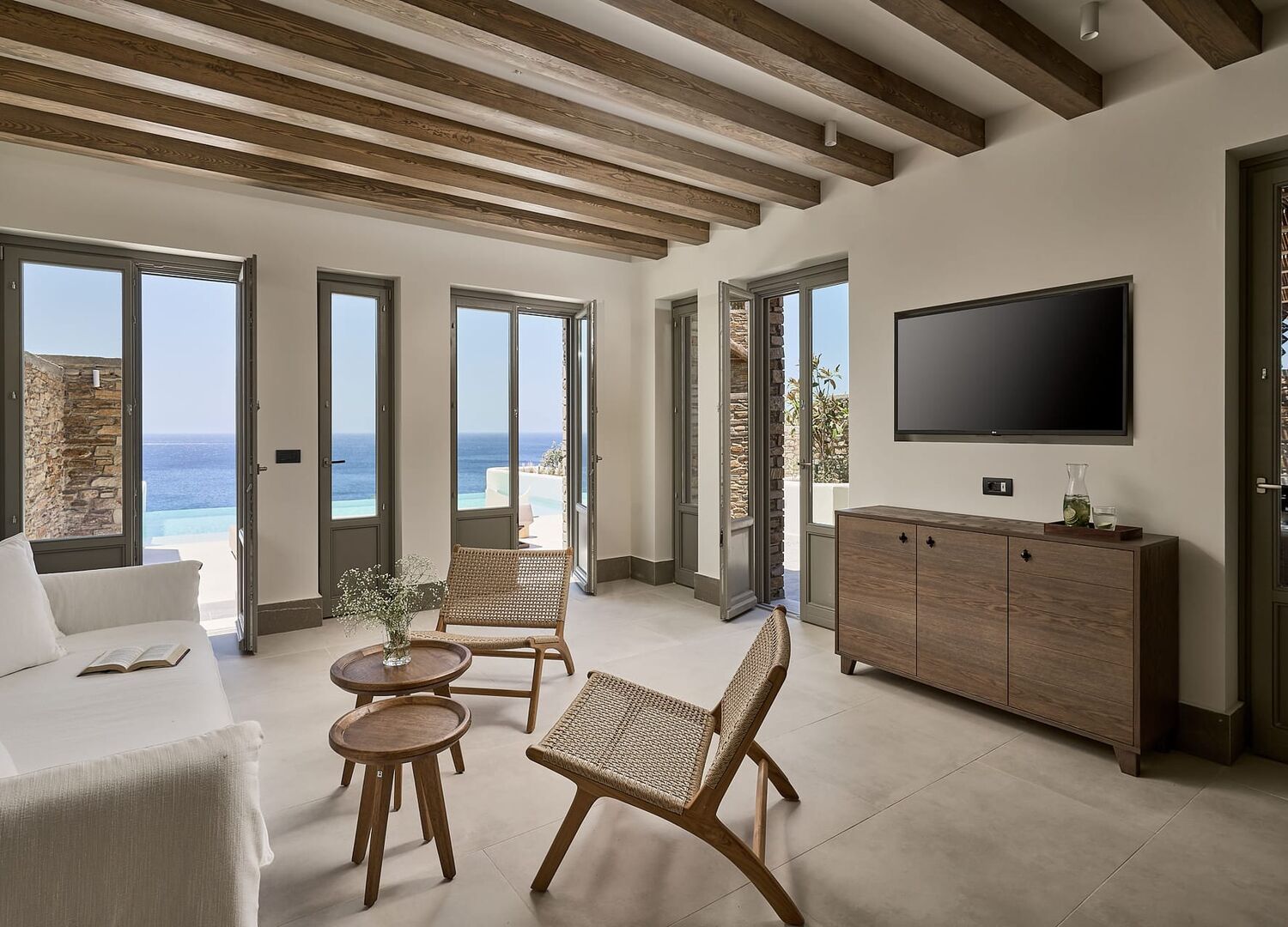 Ios Grand Pool Suites was created with the Cycladic architecture and tradition at heart. Every corner holds a recollection of the Cycladic essence and a part of its very landscape. Local stone -right off its cliff- was used in extend to build the suites blending them harmoniously with the mountainous scenery. Strongly connected with the island, the new hotel stands as the luxury example of its architectural evolution, while featuring infinity pools with breathtaking views of the sea boasts an elevated outdoor living. From the wooden beams on the ceiling and the decorative motifs to the carved arches and the shutters closing inwards, every detail states the infusion of the island’s history and architecture.