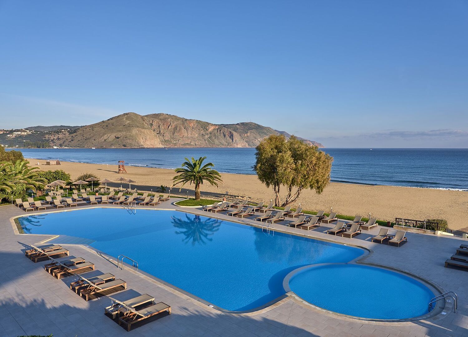 On the northwest shoreline of Crete, in the bay of Almyros near the picturesque fishing village of Georgioupolis, halfway between Chania and Rethymno amongst scenery of unparalleled beauty, and near settlements that retain traditional Cretan elements but also villages with a cosmopolitan atmosphere, lies Pilot Beach Resort. Pilot Beach Resort offers a unique combination of tradition, hospitality and luxury with the comforts of a state of the art hotel within its 150.000 square metre area. The hotel is situated within an area of distinctive natural beauty and is surrounded by olive groves, avocado trees and a beautiful sandy beach, 400 m in length. It is comprised of a central building and groups of Bungalows of various types that form neighborhoods. The architectural style blends elements found mainly in traditional cretan villages and uses cretan materials such as wood, stone and marble. Pilot Beach Resort stands out for its high level of services offered for the guests and is promoted as one of the finest holiday resorts in Crete.