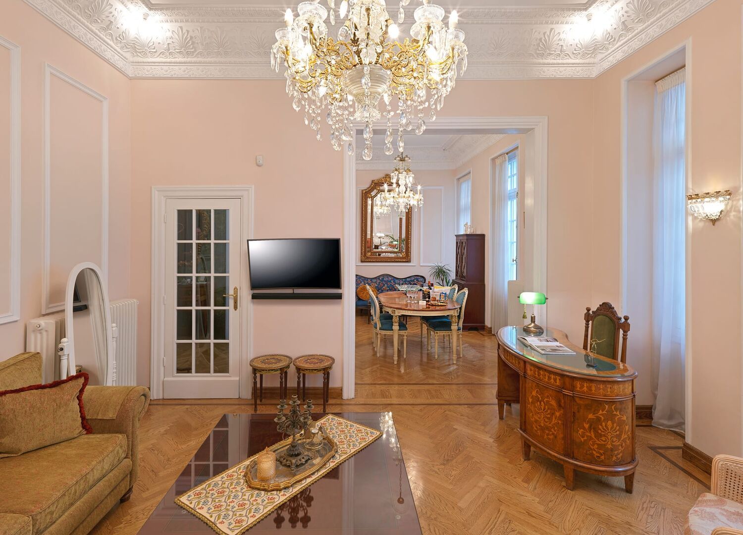 Ideally located in the most elite area in the heart of Athens, this iconic building of 1928, where the apartment is contained, is considered a precious gem of the Greek Neo-Classic style. Fully renovated in 2017 while keeping its genuine aristocratic ambiance, this luxurious apartment will certainly grant a memorable and relaxing staying. Either you enjoy the amazing Lycabettus Hill view from the balcony, have dinner in the classy dining room, relax in the most comfortable beds, or decide to explore the city's numerous highlights, restaurants and boutiques -just minutes away- the options to spend your time are truly countless.
