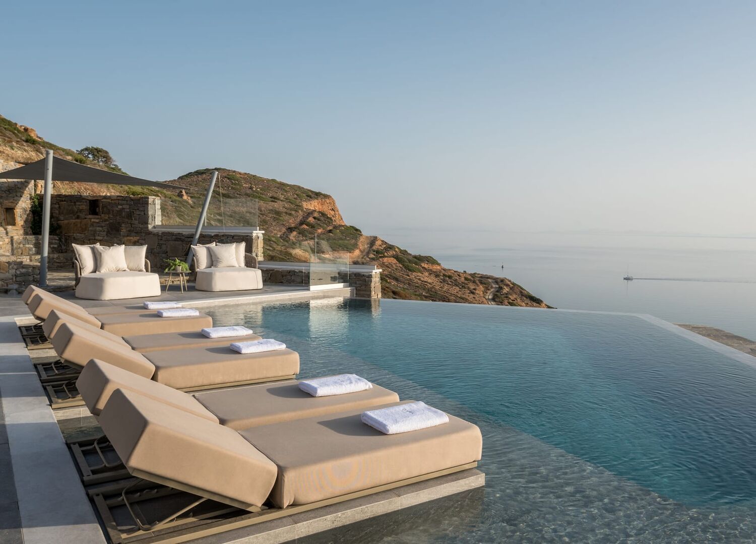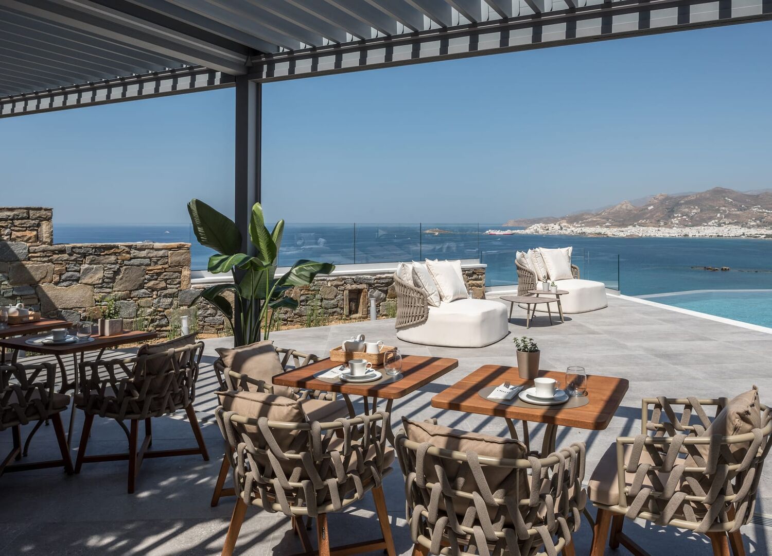 Two stunning infinity pools overlook the endless blue of the Aegean, while the restaurant and bar serve exquisite creations made from the island’s freshest local produce, alongside signature cocktails. Private yoga sessions, daily housekeeping, room service, and concierge services complete the ultimate luxury experience.