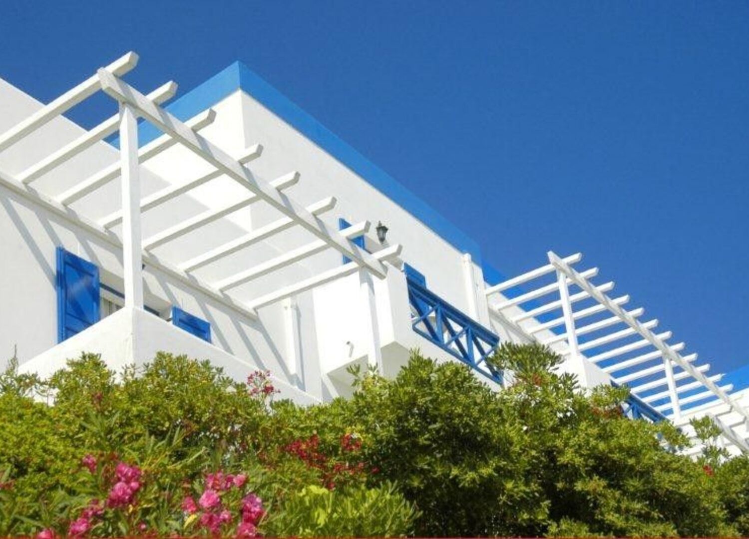 Dolphin Bay an elegant, relaxing and classicaly bautiful 4* resort, covers an area of 20.000 square metersand was built amphitheatricaly in traditional Cycladic architectural style, will impress you with its multi-level architecture, its natural stone structures and its typical Aegean blue and white color scheme.
