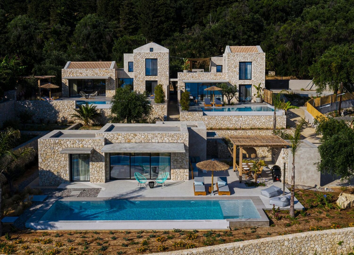 Three villas in the area of Paramonas Corfu, just a few minutes walk from the sandy beach. Each villa has a private pool and great views to the Mediterranean sea. Taking our cue from the way we live we developed this project with environment in mind. Materials used in the building process are eco-friendly resulting in highly energy efficient structures.