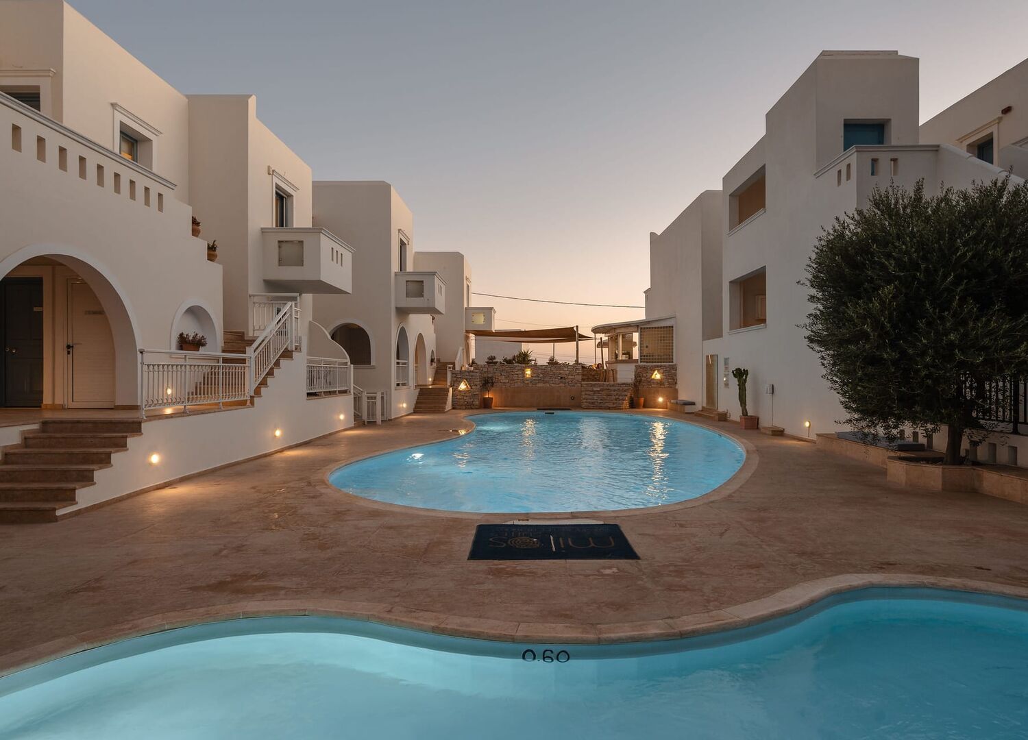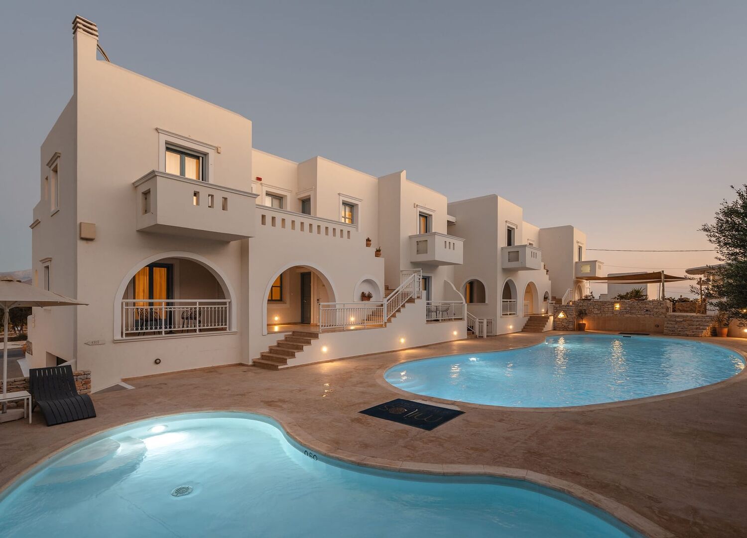 Clean, whitewashed facades, soft curves, and geometric lines harmonize with natural stone and earthy accents, creating a timeless aesthetic and a sense of balance. In the outdoor areas, two spacious swimming pools and dedicated children’s spaces stand out, offering moments of refreshment and carefree enjoyment under the Naxian sky.