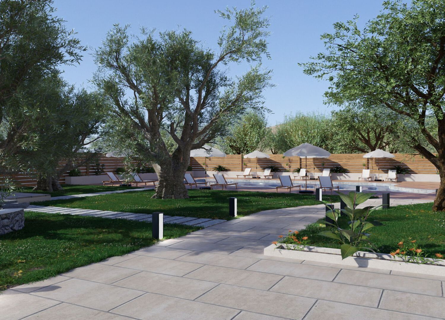 Nestled among the lush gardens with olive trees, our sparkling pool is ideal to rest under the bright island sun in Hotel Nefeli Fresh.