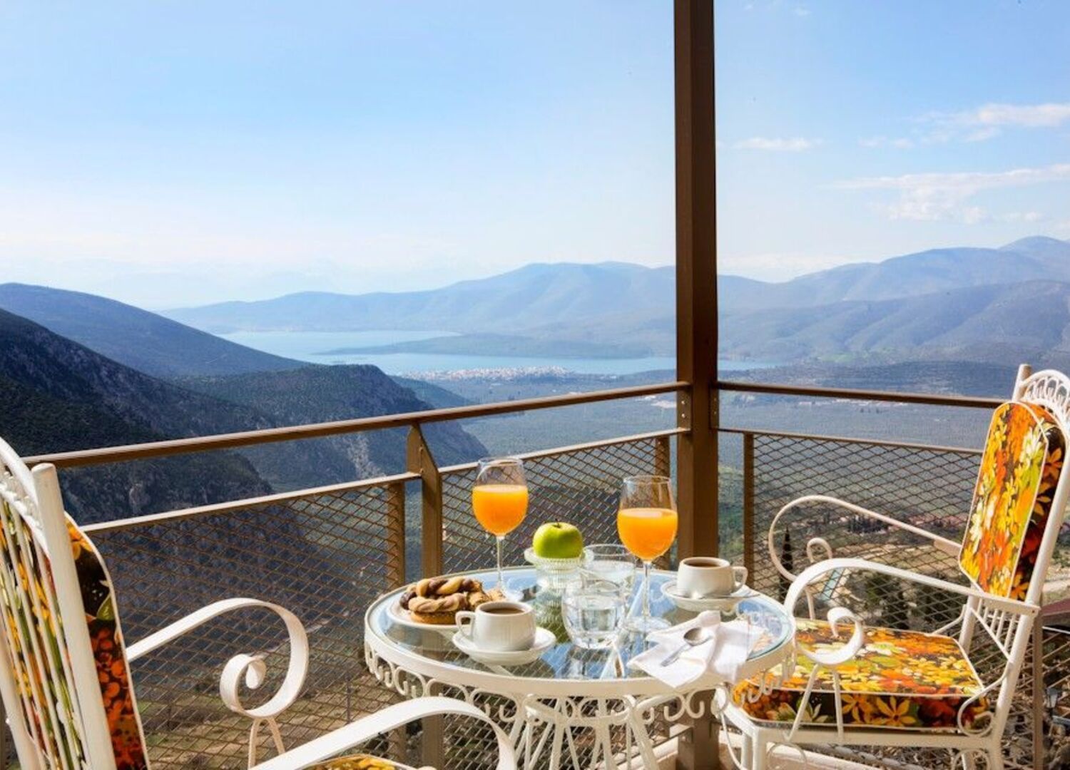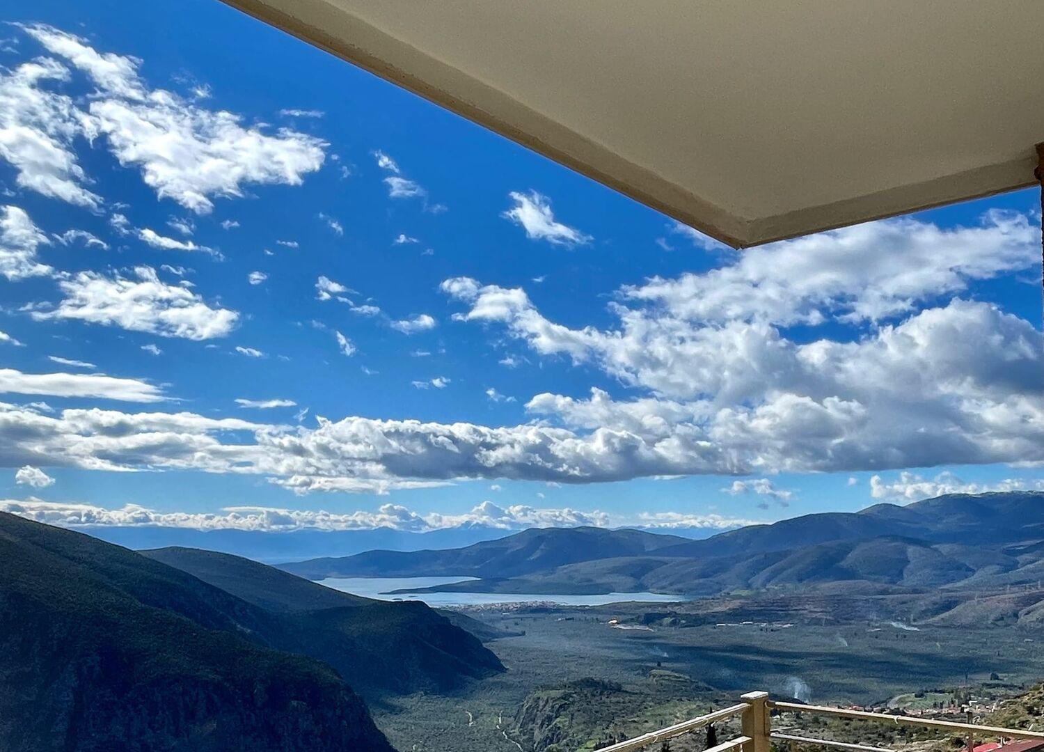 • Panoramic view of Delphi, the Amfissa olive grove, and the Corinthian Gulf from front balconies