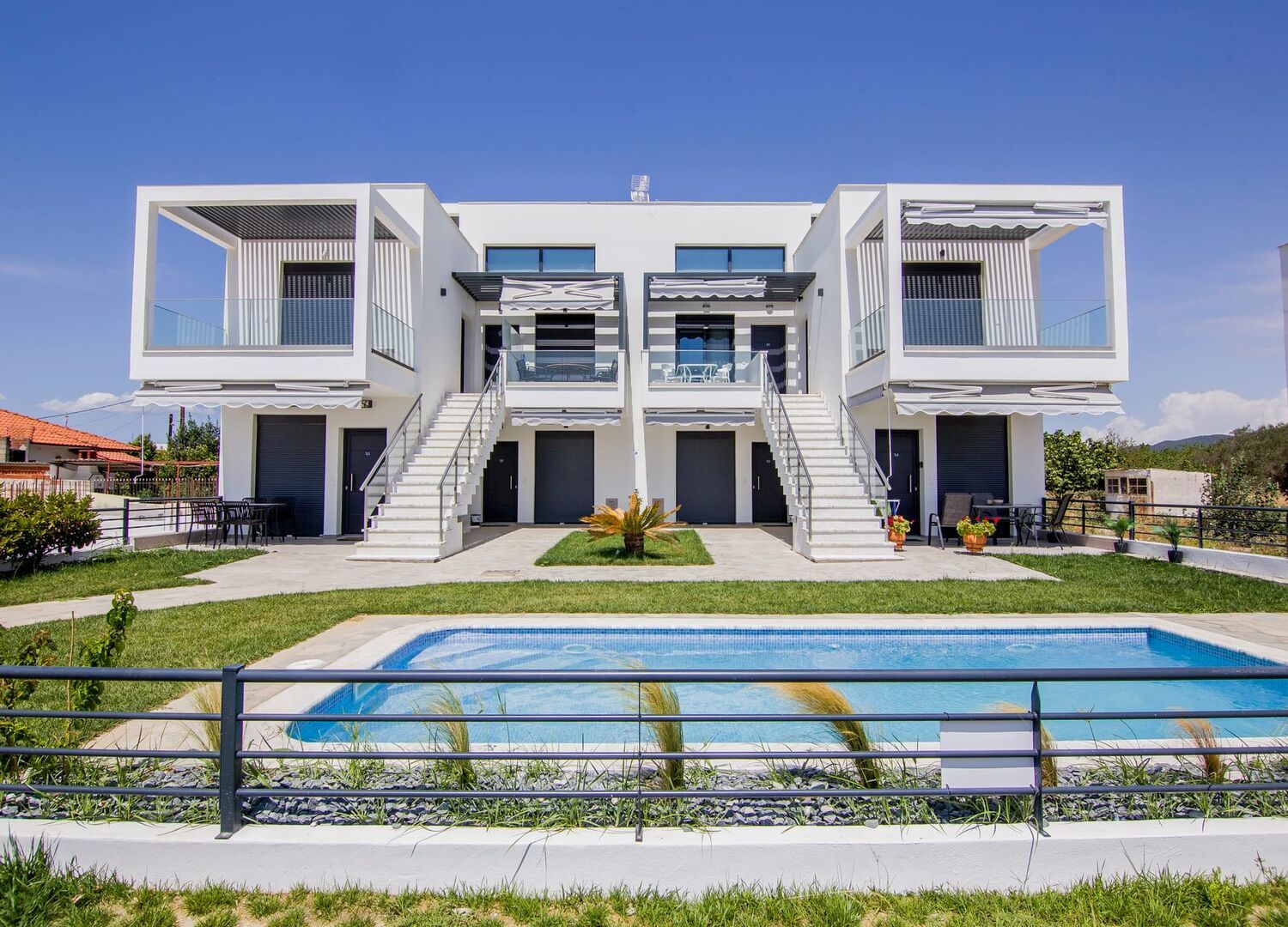 Olympiada Residential Complex & Villas is a luxurious accommodation located near the great Project Alexandrou Chora in Kavala - Paralia Ofryniou. The complex offers modern aesthetics and luxury, with terraces overlooking the blue sea for sunset gatherings. The courtyard features a barbecue and a swimming pool, with parking spaces available. The one-bedroom apartments on the ground floor are perfect for couples, while the lofts are great for group gatherings. Private detached villas with three and four bedrooms offer exclusive summer holidays with large living spaces and rooftop views of the sea.
