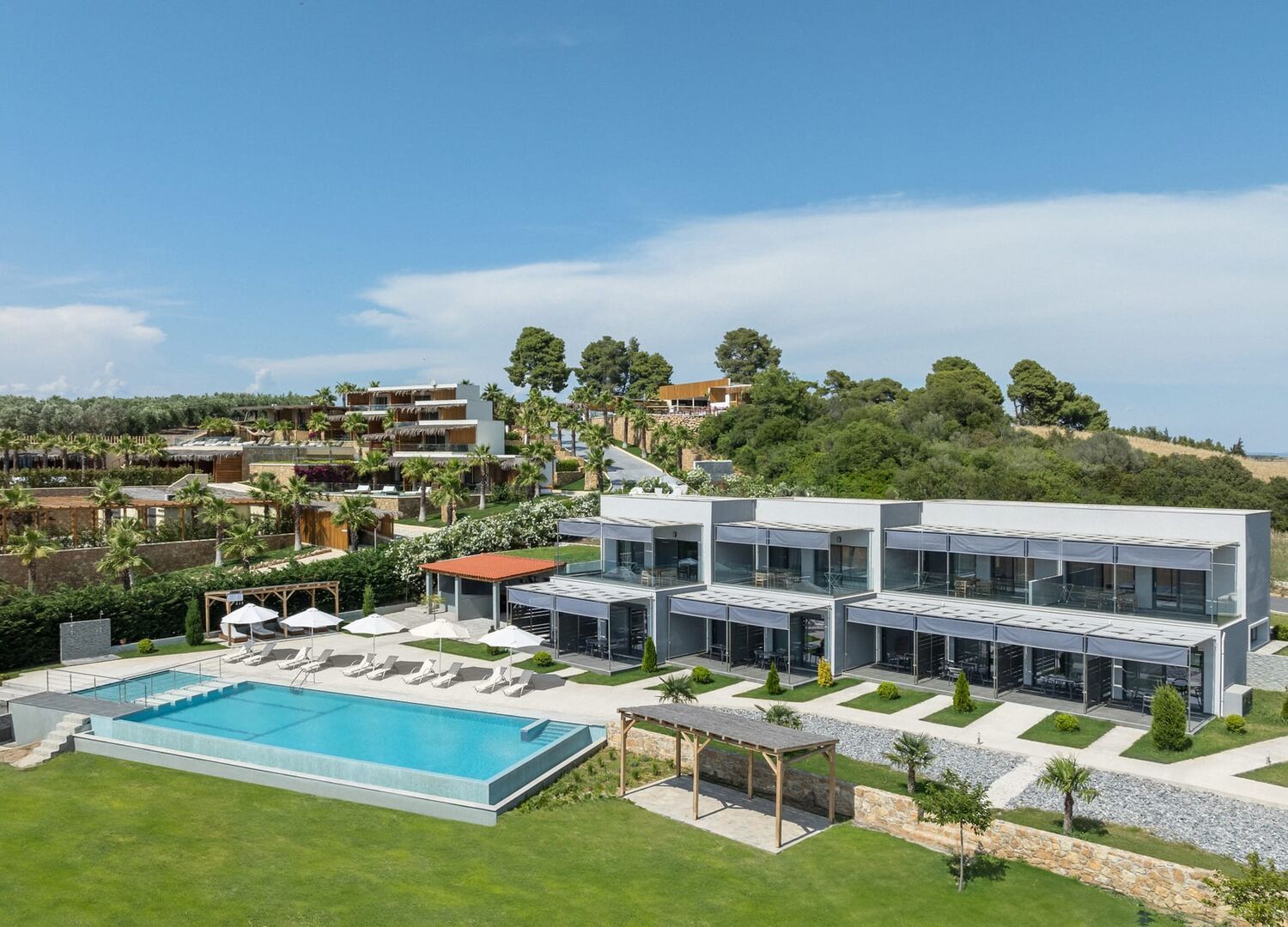 A very nice Apartment close to Sani beach with a big infinity pool facing the sea. Surrounded by nature in a really nice area of Chalkidiki. Quiet and fairly small (only 4 Units in the 1st floor and 8 in the fround Floor). The Units on the 1st floor are nice with comfortable beds and a nice big balcony from where you can see the sea and the nature. The complex itself is located on a hill therefore you have a good view. The room has a small kitchen with a nespresso machines (the capsules are refilled every day). There is also a fridge but it is fairly small and sitting on the ground therefore it is hard to reach inside without kneeling in front of it. The staff is helpfull, the rooms are cleaned every day. There is a small caffee close by to get a morning coffee and some cream or cheese pie. The next Restaurants are aprox. 10 minutes driving away. Bigger supermarkets (LIDL or Masoutis) are a 15 minutes drive away. Sani beach is not usable anymore because the area is occupied by the Hotels, there is only a small area which can be used by tourists but you have to bring you own sunbeds and umbrellas. But there a plenty of other nice beaches on Chalkidiki (e.g. in Afytos). It was a very nice stay, which we definitly can recommend.