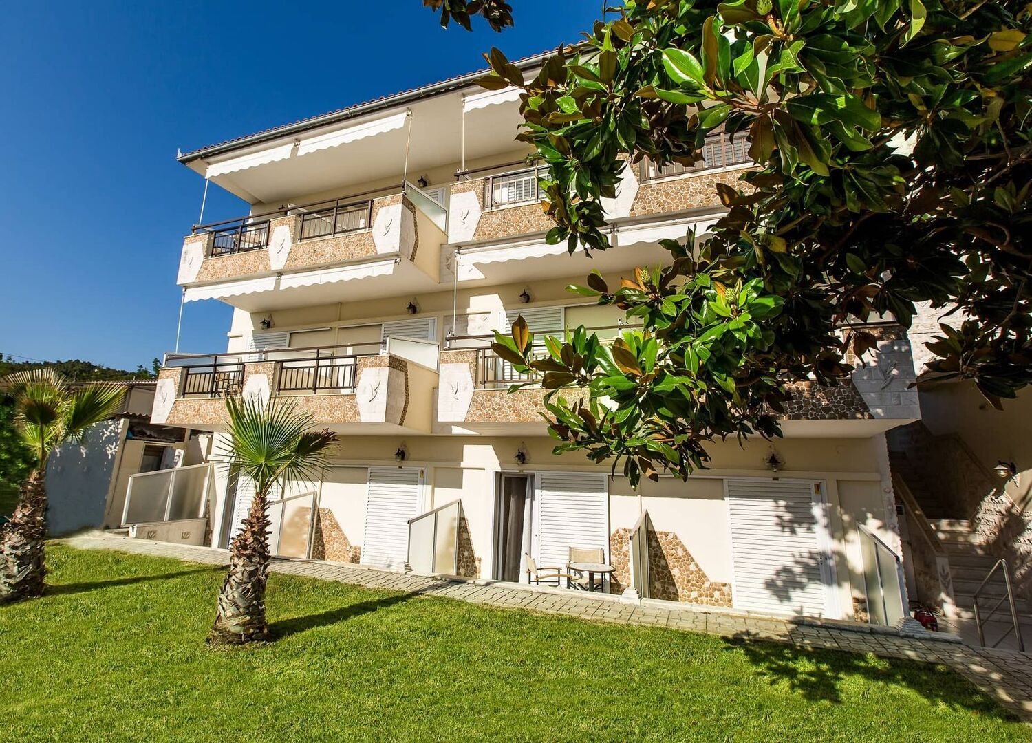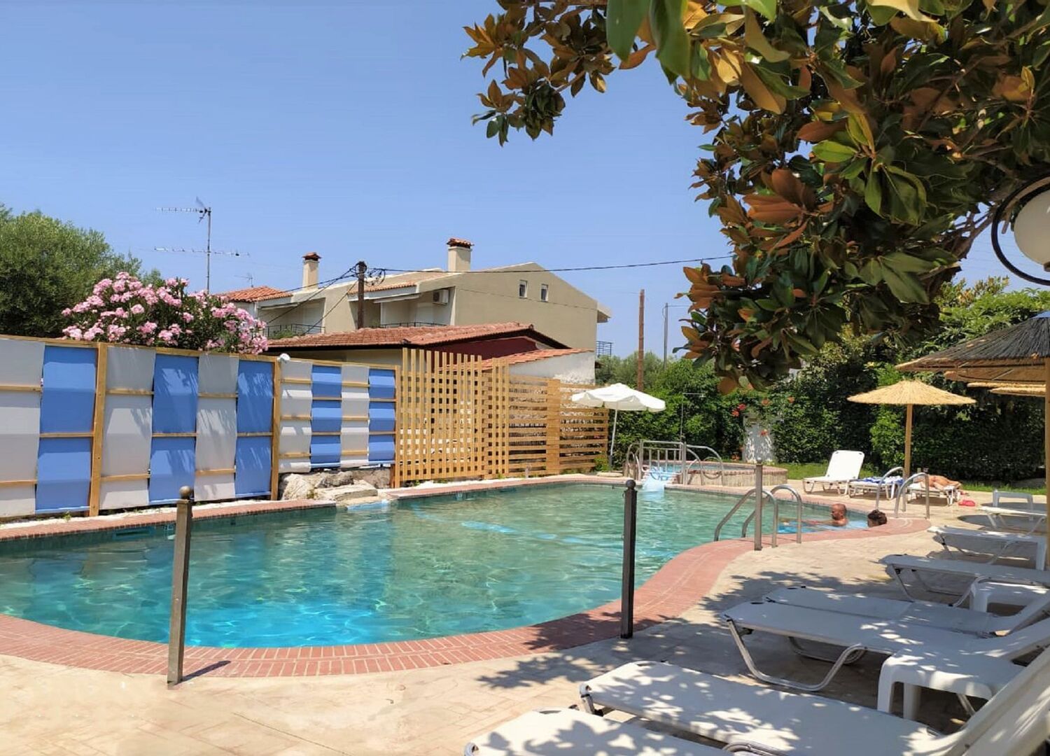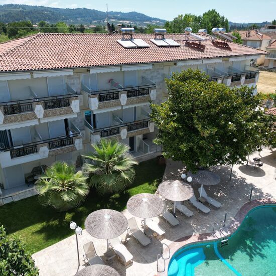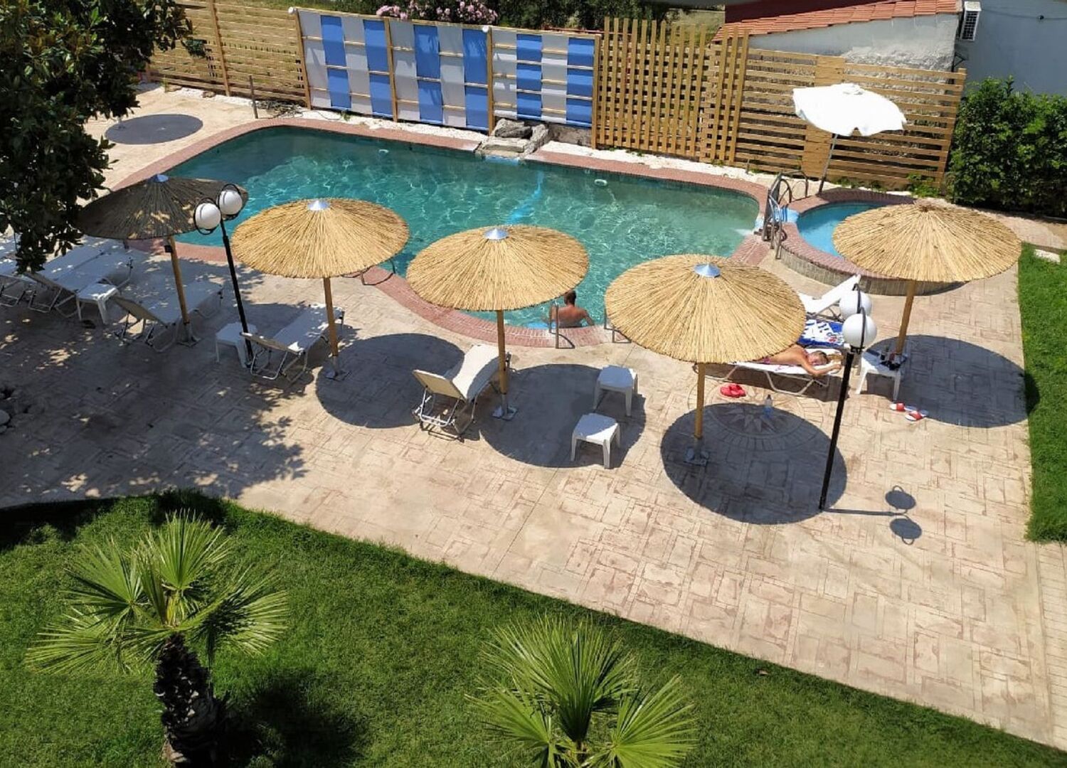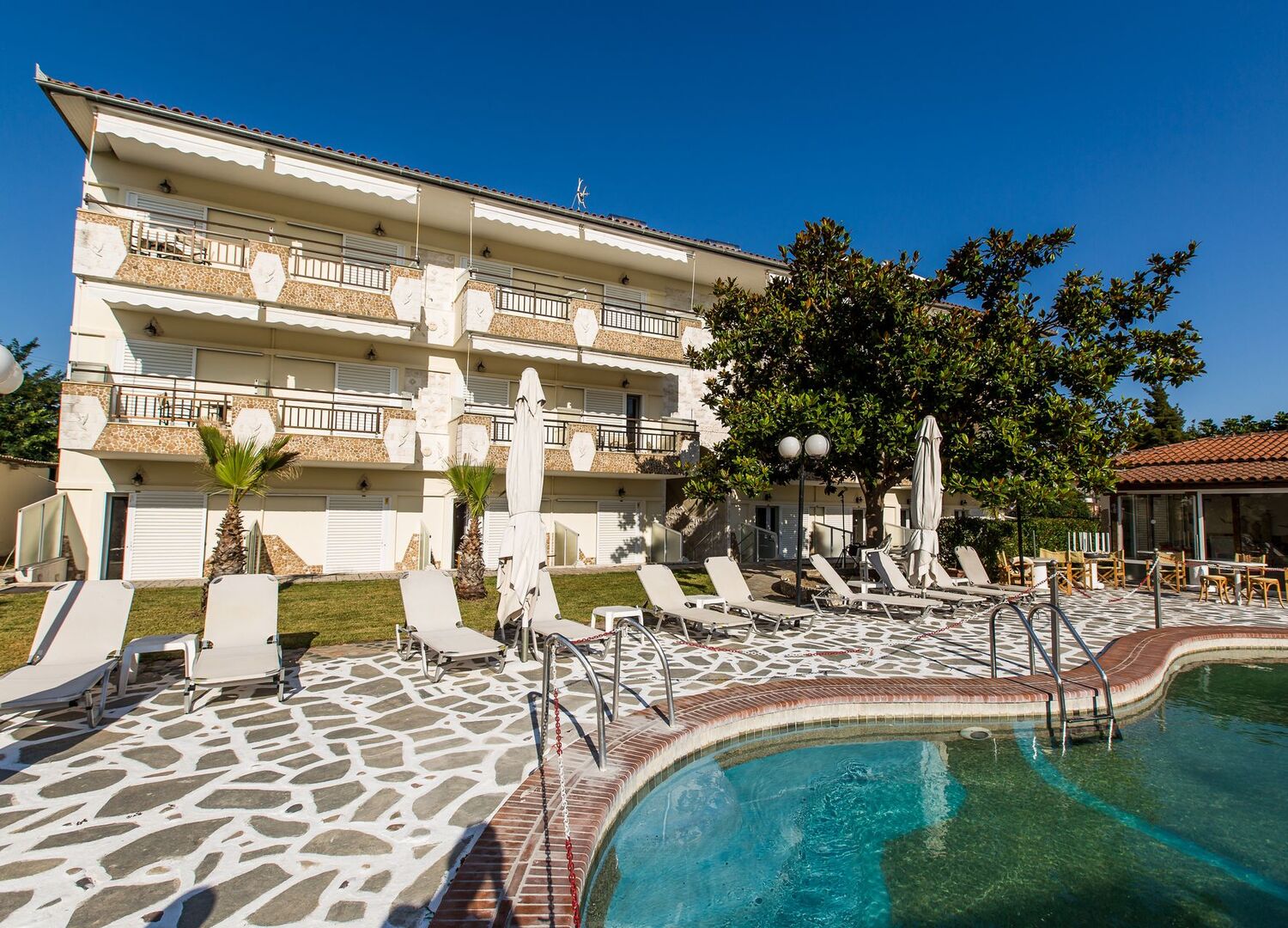 Themelis Studios by Greek Pride offers affordable accommodations in Halkidiki, Paralia Fourkas. The hotel features a swimming pool, pool bar, and recently refurbished studios with kitchenettes and balconies. Located just 400m from the sea and 500m from the village center, it is a convenient choice for a relaxing vacation in Greece.