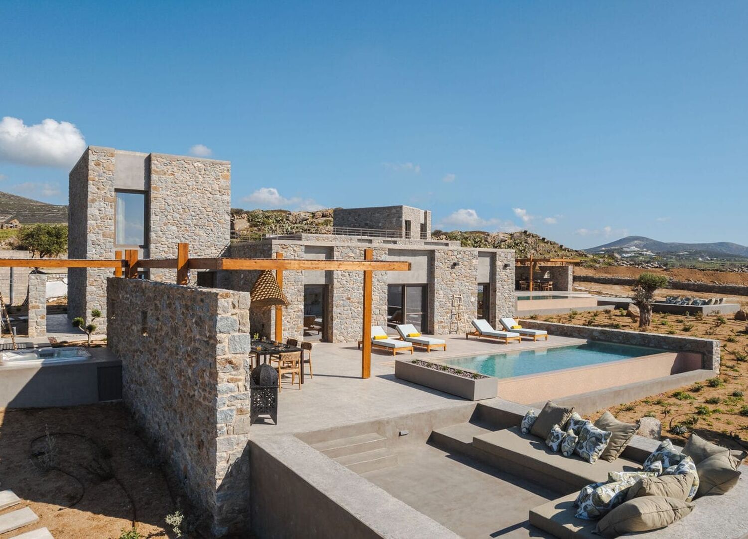 Each villa boasts a private pool and Jacuzzi, perfectly positioned to offer sweeping views of the Aegean Sea, Naxos Town, and the surrounding mountains. The interiors exude sophisticated minimalism, featuring custom modern furnishings, soundproof windows, and a calming color palette that sets the stage for complete relaxation.