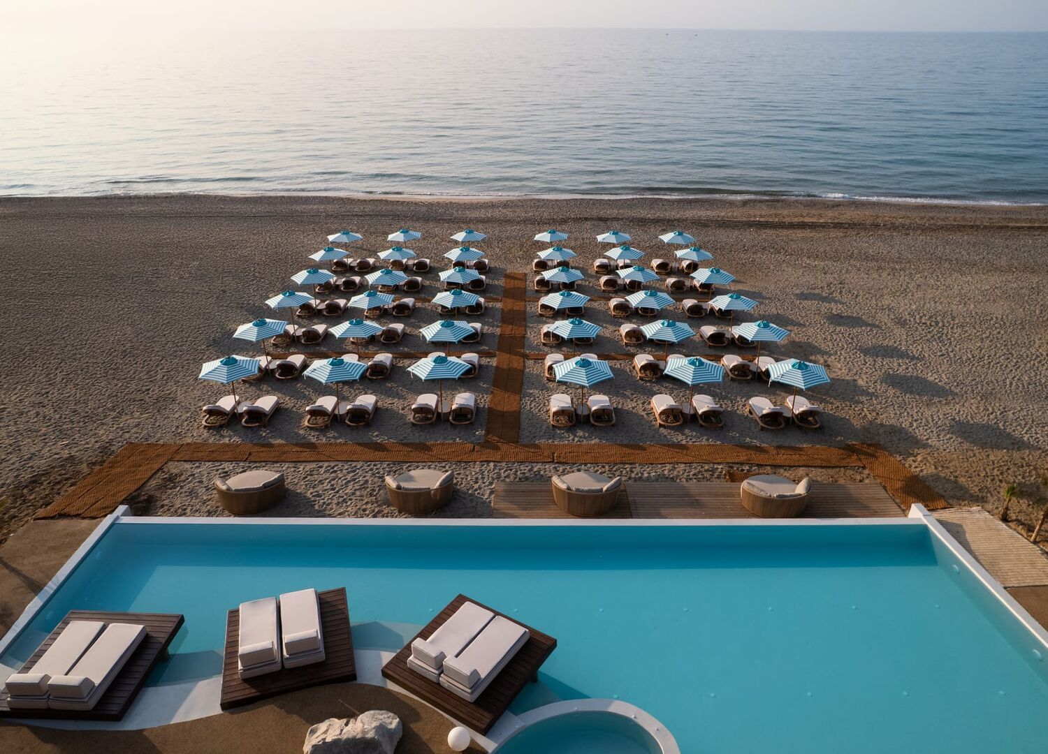 From the moment you step in, Uzenie invites you to let the abundance of nature encompass you fully as you relax and unwind in its sustainably repurposed all-day beach club, restaurant, gym, spa offering exceptional treatments utilizing Cretan herbs, or one of its 50 suites that combine earthen materials, with a particular focus on the naturally tranquil element of water, the verdant surrounding that also serve as natural borders between each suite, and unobstructed luxury.