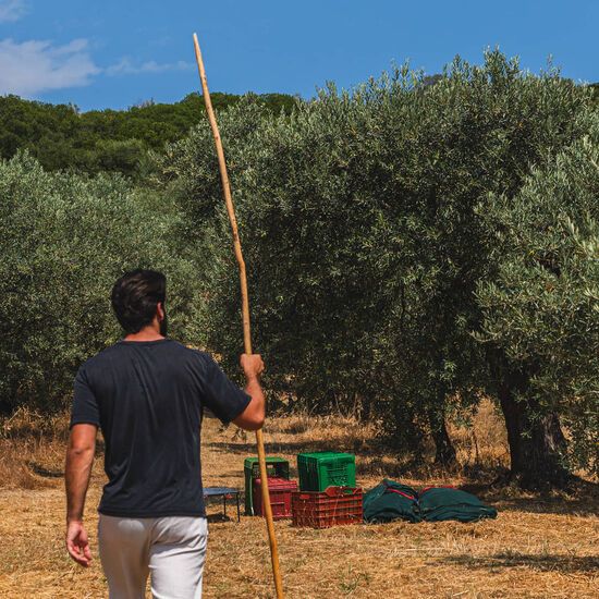 More common for olives destined for oil is branch beating, where flexible rods are used to gently strike the branches so the fruit falls onto the nets, requiring skill to avoid harming the tree or olives.