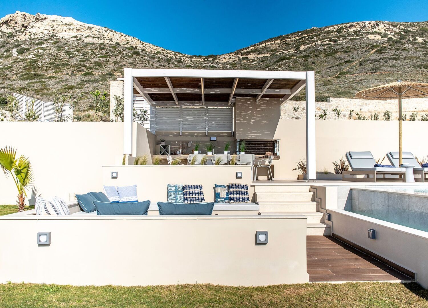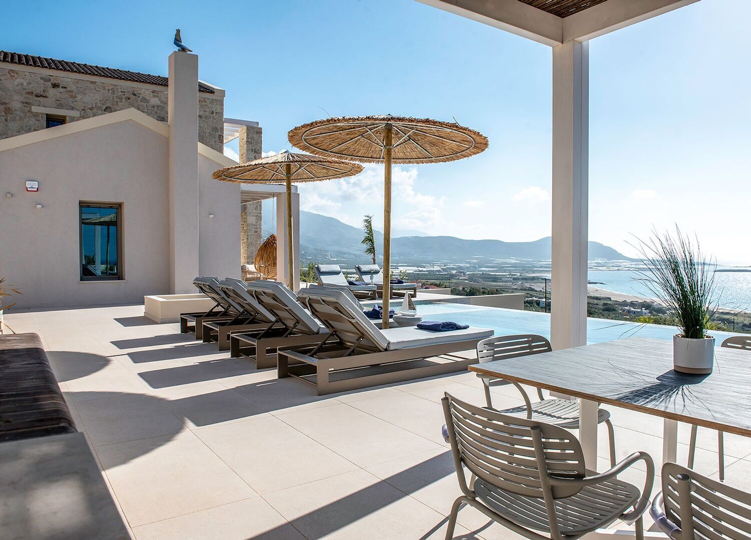 Every villa offers a private swimming pool, spacious terraces, and unobstructed views of the turquoise sea and magical sunsets of western Crete. Modern interiors blend harmoniously with natural elements, while large windows and open-plan designs create a feeling of openness and connection to the landscape. From peaceful mornings by the pool with coffee in hand to long summer evenings with a traditional BBQ under the stars, Cielo e Mare Villas provide the perfect setting for moments of joy, relaxation, and togetherness.