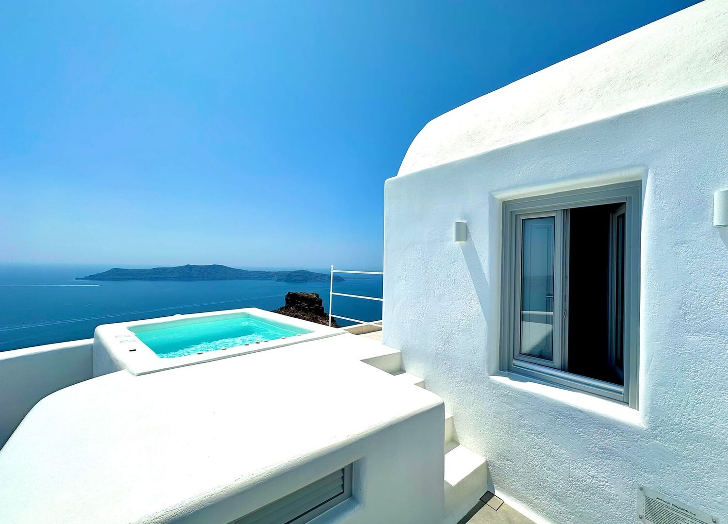 Eteoro Suites consists of one Junior Suite with outdoor jacuzzi pool on the edge, ideal for couples, one Cave Suite with large outdoor jacuzzi pool for up to 3 people with a king bed and a single sofa bed and a unique architecture carved in the rock, two Honeymoon Suites with outdoor jacuzzi pools ideal for couples, capable to accommodate up to 3 people and the highlight of our hotel, the Grand Suite with private infinity pool on the edge with 2 master bedrooms with bathrooms, large living room and a huge outdoor balcony with the heated infinity pool with jets.