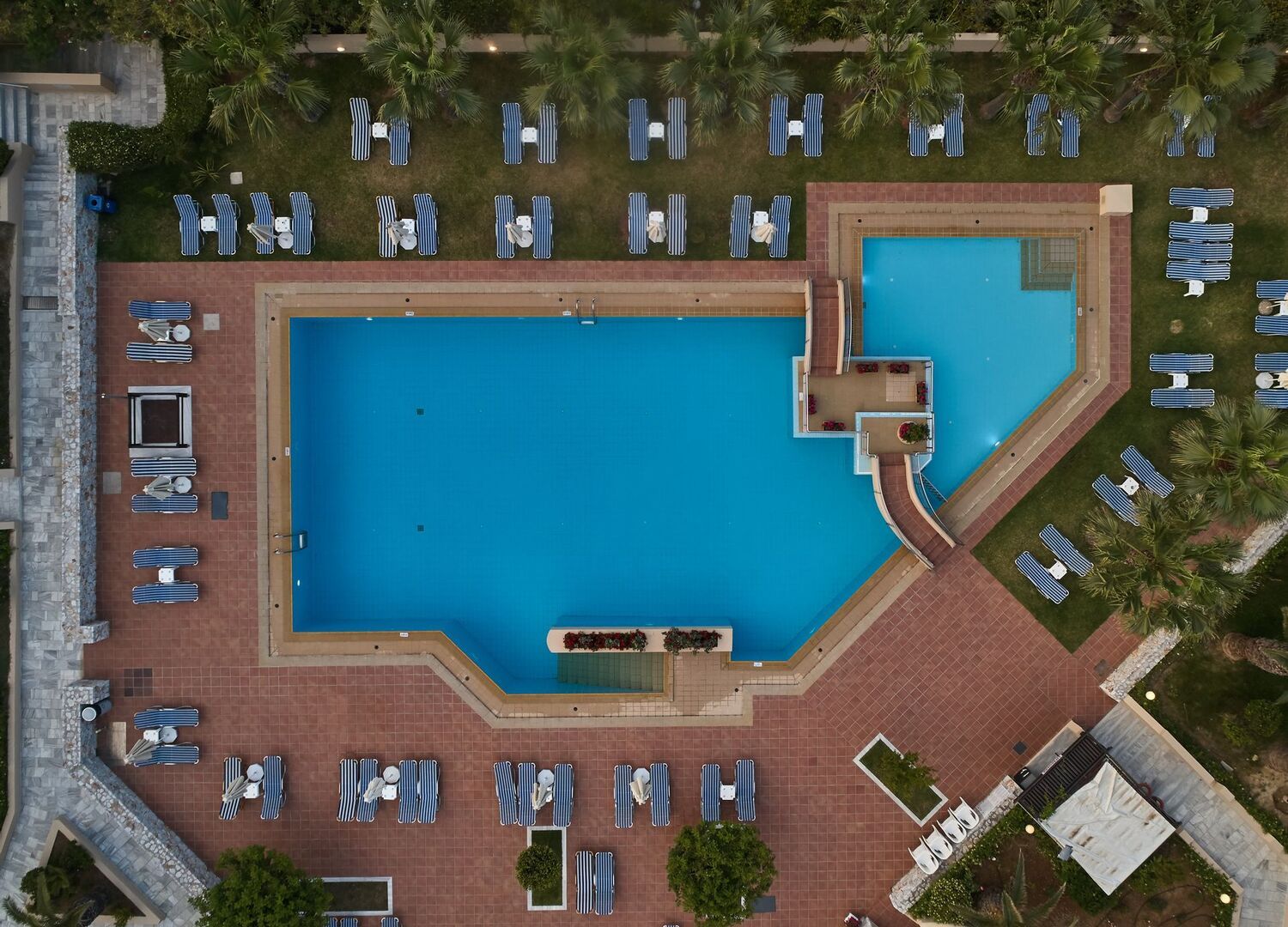 At the beach complex, the 24 hour reception and lobby area is spacious, airy and fresh. It has several sitting areas including a warm and cozy fireplace lounge, internet corner and main bar. The main restaurant (buffet) and its outdoor seating areas are steps from the sea. The exclusive Azzuro a la carte restaurant, outdoor bar and children’s playground also enjoy this prime location.