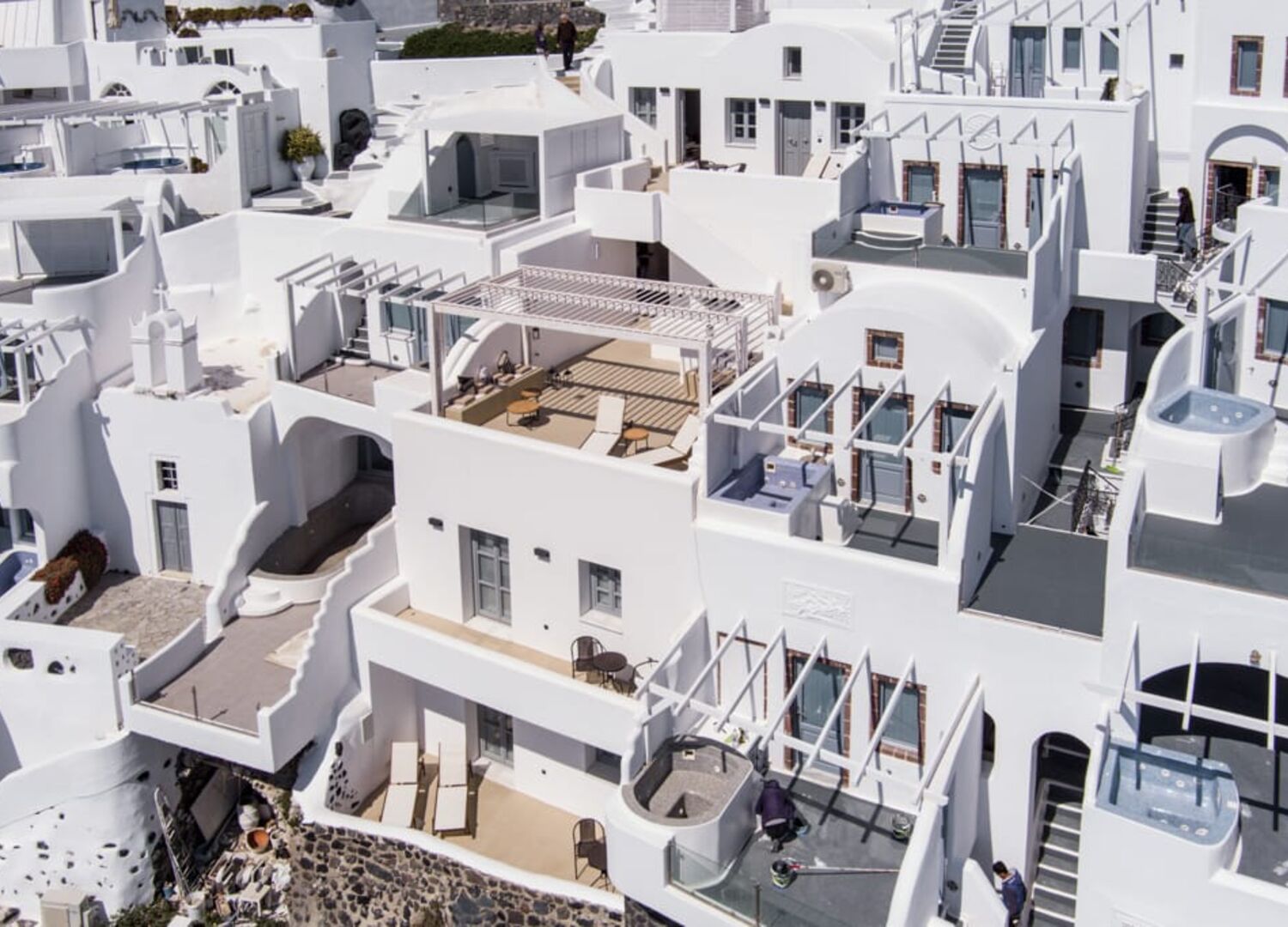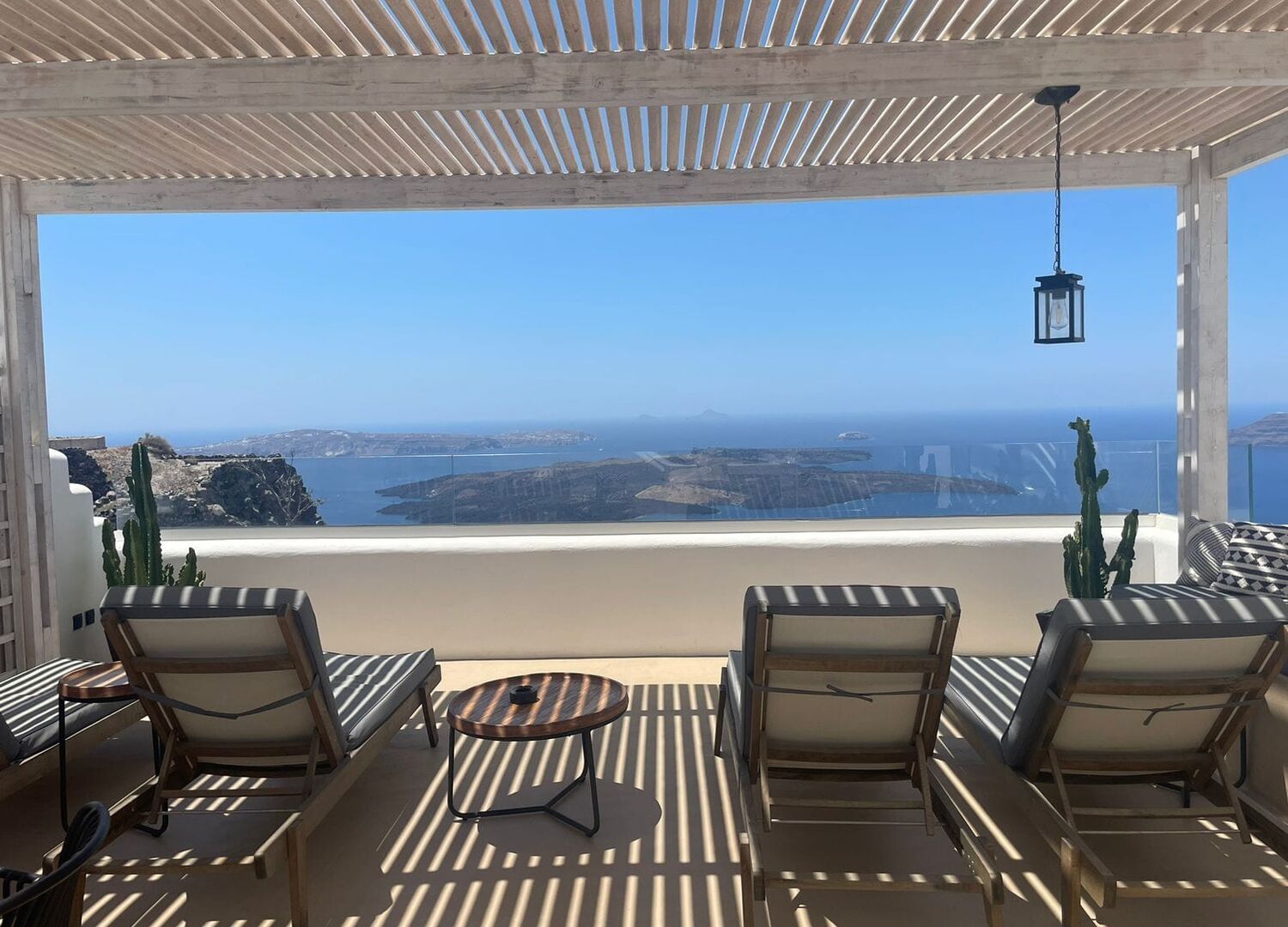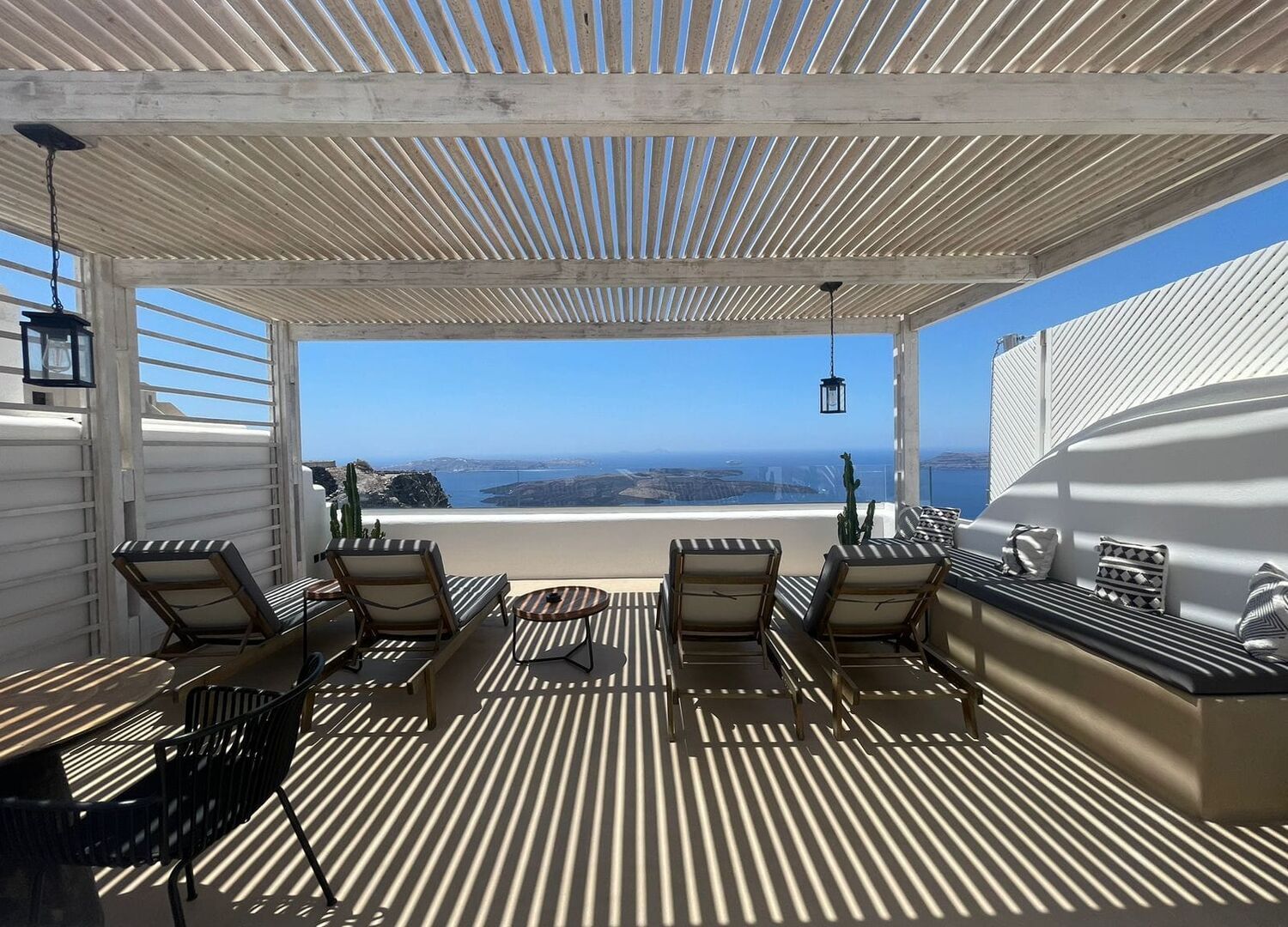 All our suites comply with the islands’ minimalistic aesthetics overlooking the Caldera and the volcano from their balconies. The outdoor common terrace with seating corners and sun loungers, offer the ultimate relaxation and enjoyable sunset view.